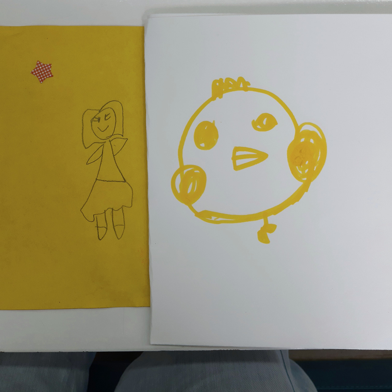 에린이 집에 가면서 붙여준 스티커. 나딘과 싸르나가 그린 내 모습과 노란 병아리.