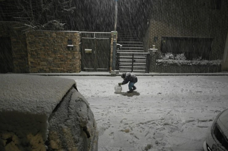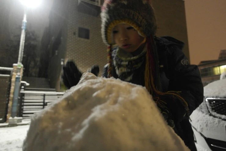 아들은 한밤중 눈밭에 뒹굴게 허락해 줬다는 사실만으로 벙글벙글 신이 나서