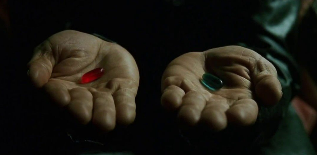 영화를 보지 않은 이들을 위해 간략하게 설명하면, 빨간 약을 먹으면 이상한 세계에 남아 진실을 파헤치지만 파란 약을 먹으면 모든 것을 잊고 편안한 가상세계로 되돌아간다. 극의 서사 상 주인공으로서 진실을 외면하는 행위는 용납될 수 없기에, 주인공 네오가 빨간 약을 먹는 결단은 매우 자명하다. 하지만 만약 이 질문이 네오라고 하는 주인공의 영웅담이 아닌, 실제 당신에게 주어졌다면? 당신은 빨간 약을 선택할 것인가?