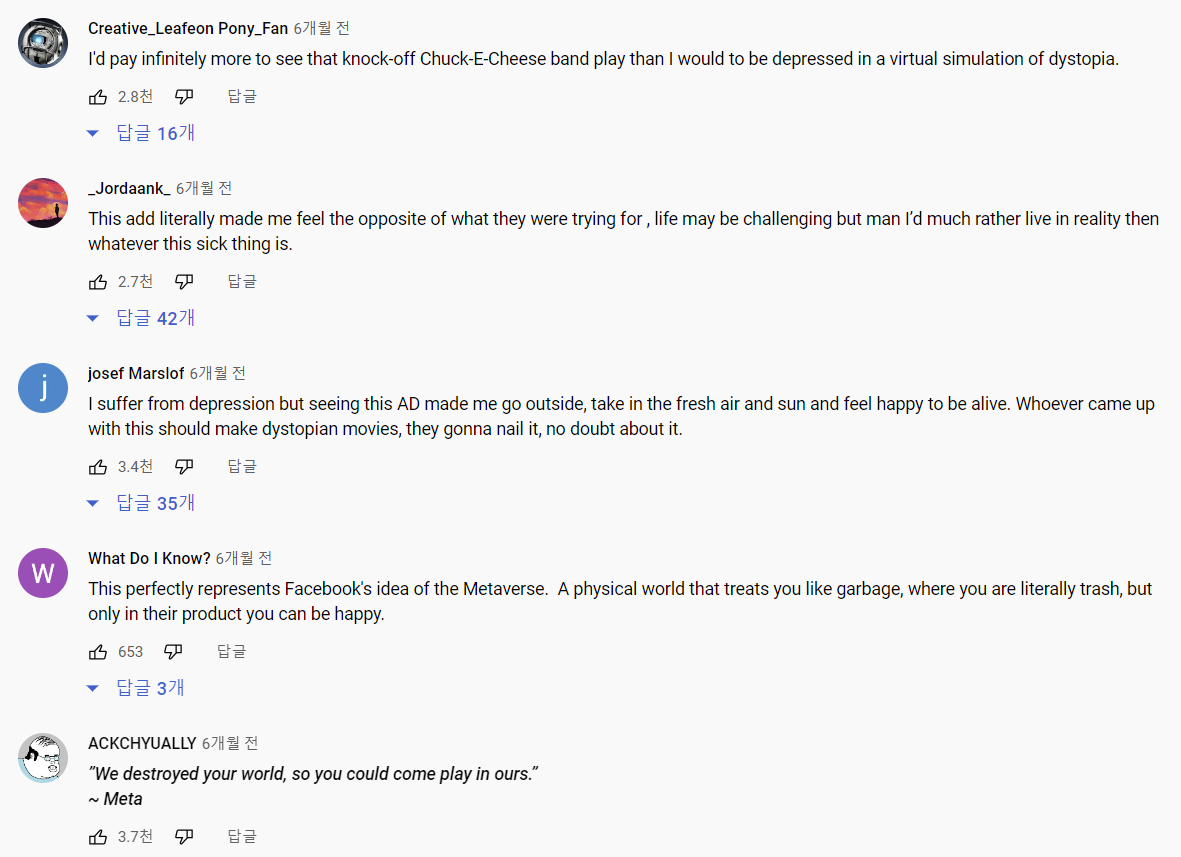 메타의 슈퍼볼 광고를 본 시청자들은 하나같이 입을 모아 '메타의 의도와 전혀 다른 결과를 낳았다'라고 말한다. 이 광고에서 주인공 인형들이 가상세계 안에서 행복하면 행복할수록, 그들은 더 초라해진다는 것이다. 왜냐하면 가상세계는 '진짜'가 아니기 때문이다. 결국 가상세계에서 얼마나 행복한 세계를 보내든 VR기기를 끈 순간 우리는 조금도 나아지지 않은 현실로 돌아와야 한다. 바로 이 점이 문제점이다.