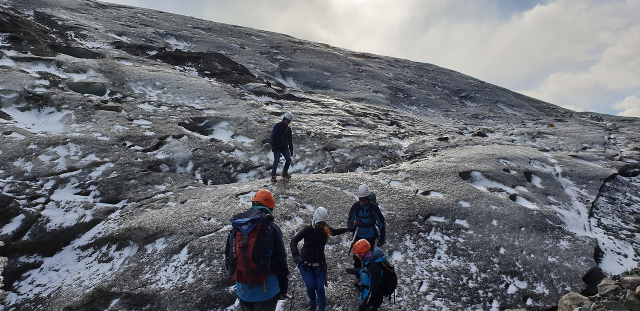 안전장치를 착용하고 산길을 걸었다. 트레킹 하는 동안 하네스는 도대체 어디에 쓰는 건가 했는데 혹시나 크레바스 안으로 떨어질 경우 구조를 용이하게 하기 위해서란다. 아하..!