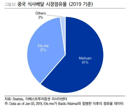 어러머가 바이두 와이마이를 인수할 때만 해도 격차를 벌린 1위 탄생이라는 언론 기사가 쏟아지더니 지금은 메이투완이 압도적인 1위다. 어러머는 왜 바이두 와이마이의 점유율을 제대로 흡수하지 못했을까? 나중에 써보면 알겠지 뭐.