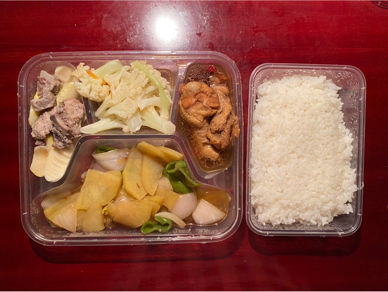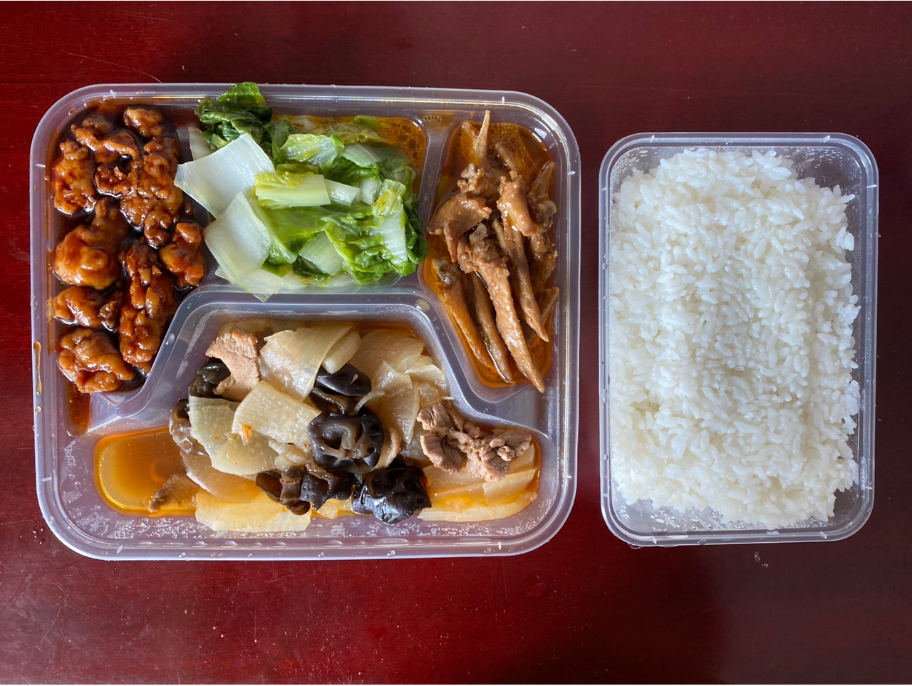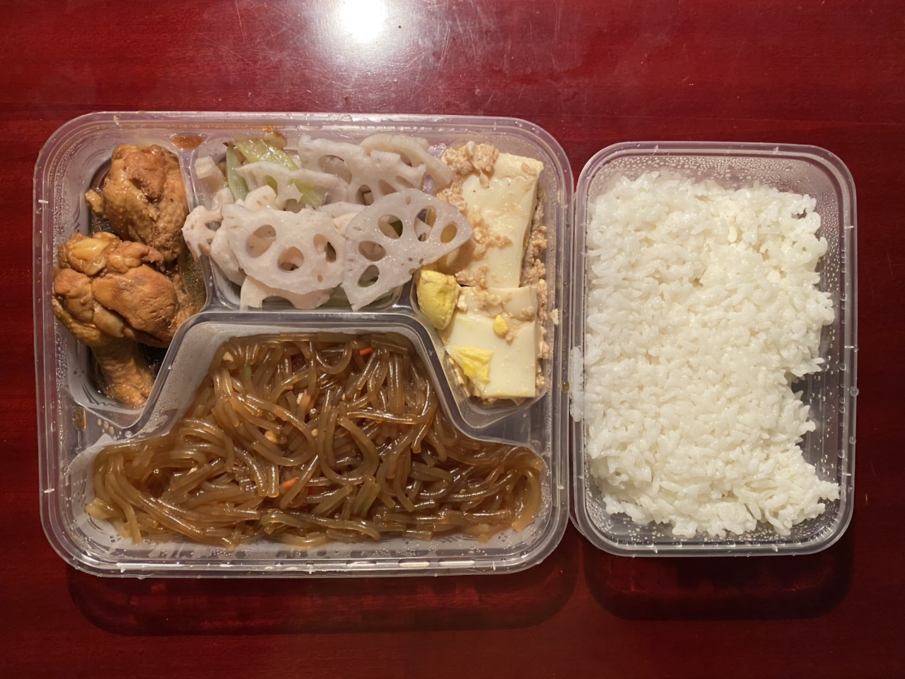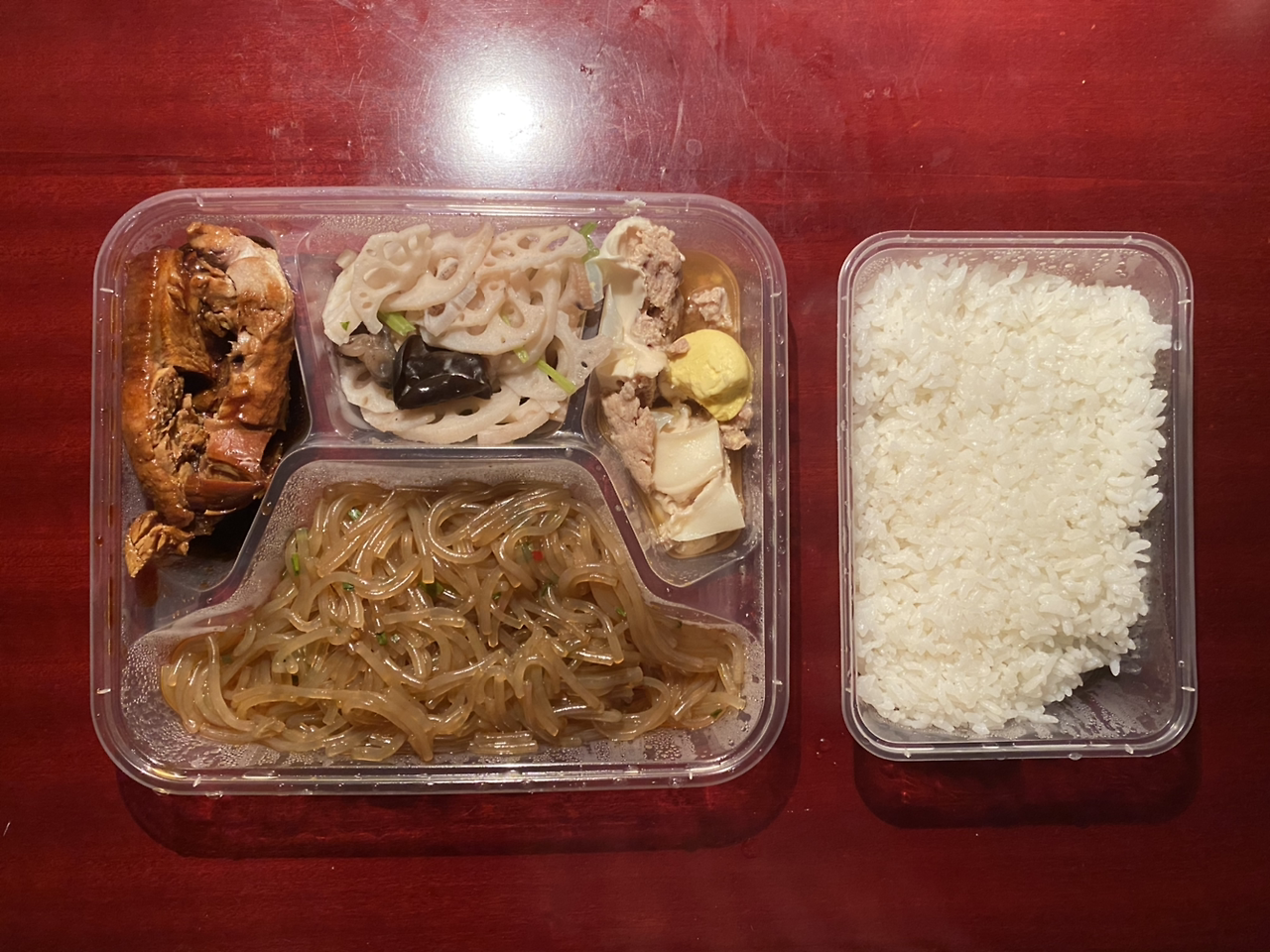 2) 점심: 살짝 시면서 너무 달콤했던 양념 닭고기, 닭날개뼈(?), 목이버섯 & 돼지고기 & 무, 야채