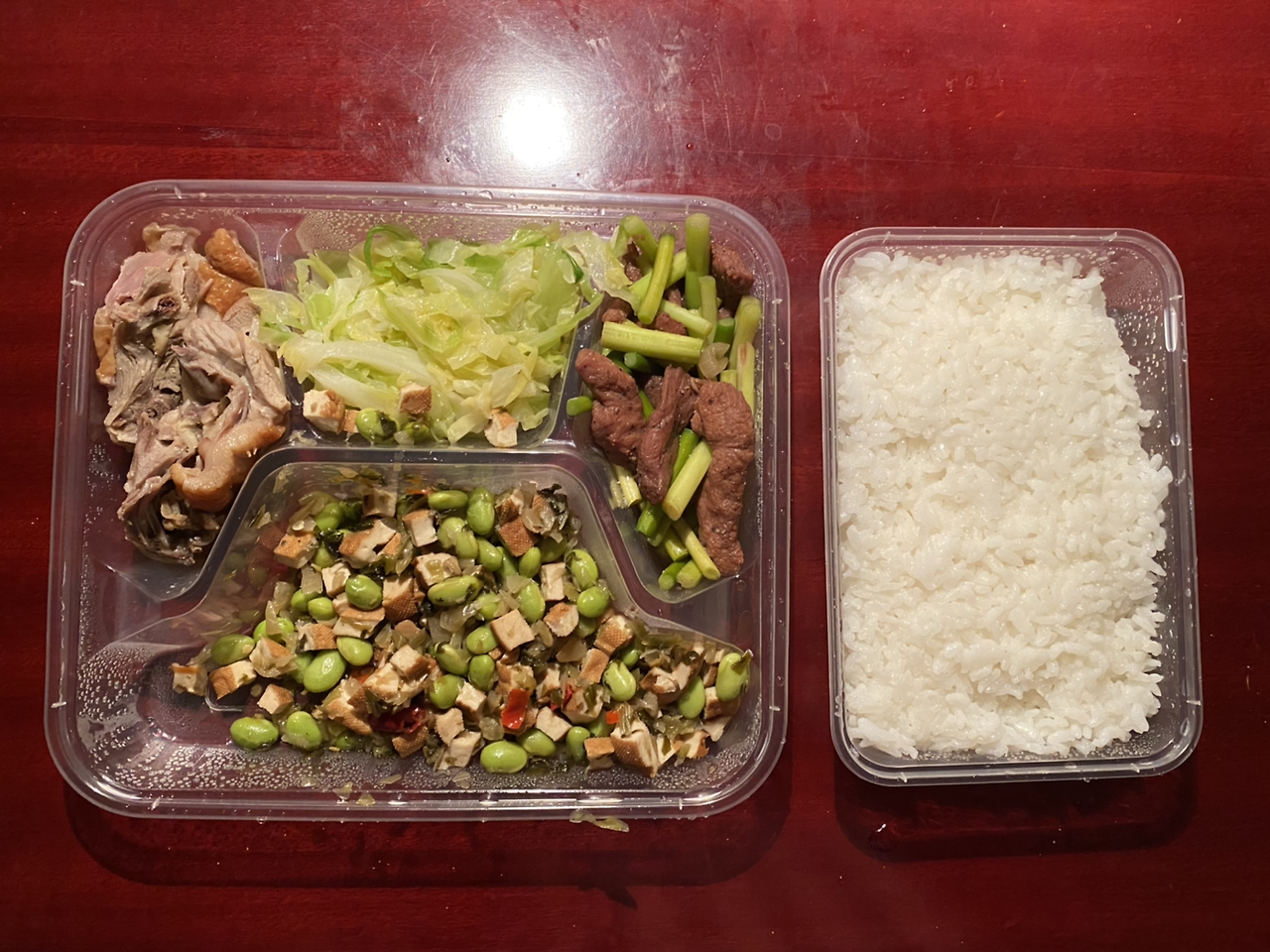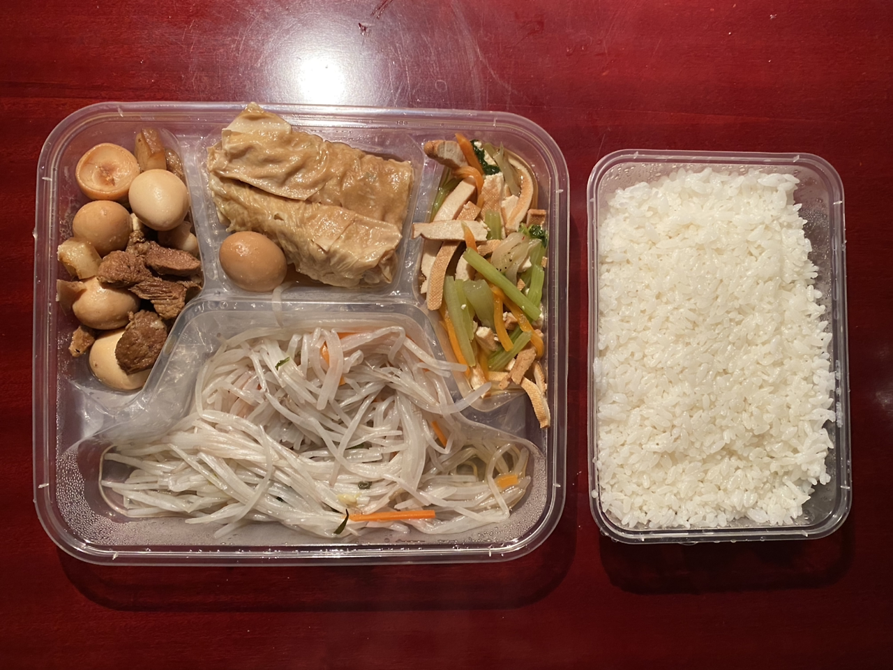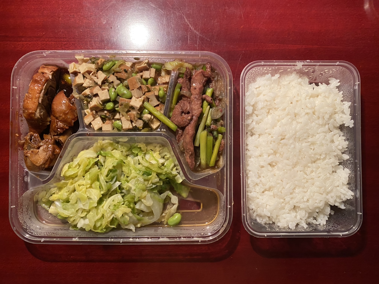 3) 저녁: 콩고기 같은 맛이 나는 고기+마늘쫑, 야채, 양념 돼지고기, 어묵 같은 두부(인가..? 항상 이게 뭔지 모르겠단 말이지)