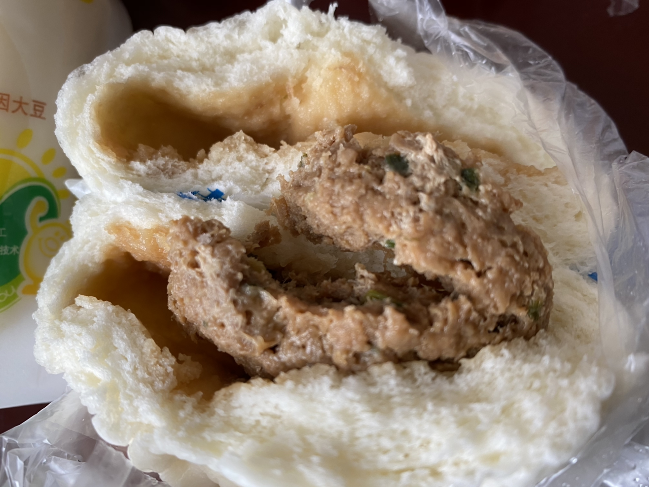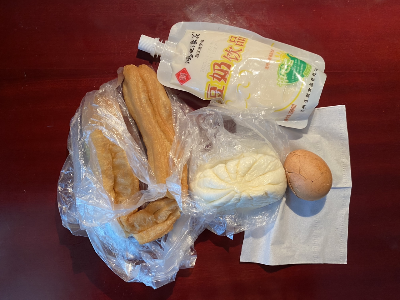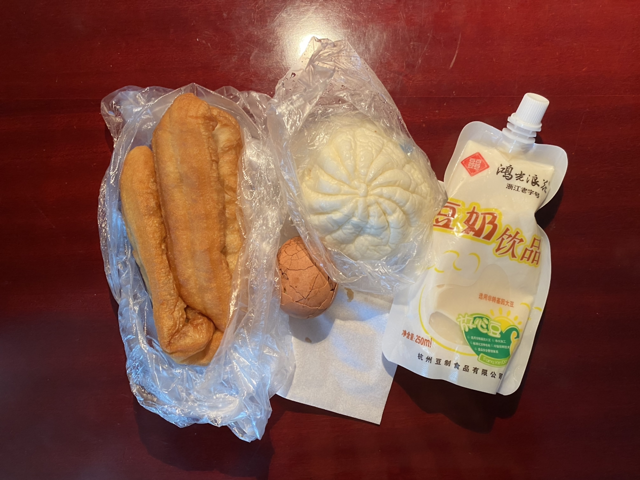 1) 아침: 적당히 쫄깃한 요우티아오(油条, 기름에 튀긴 빵), 차가워서 기분 좋게 마신 또우지앙(豆浆, 두유), 달걀, 매우 단 빵