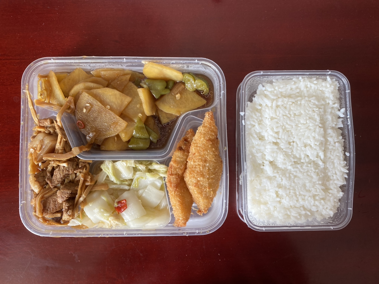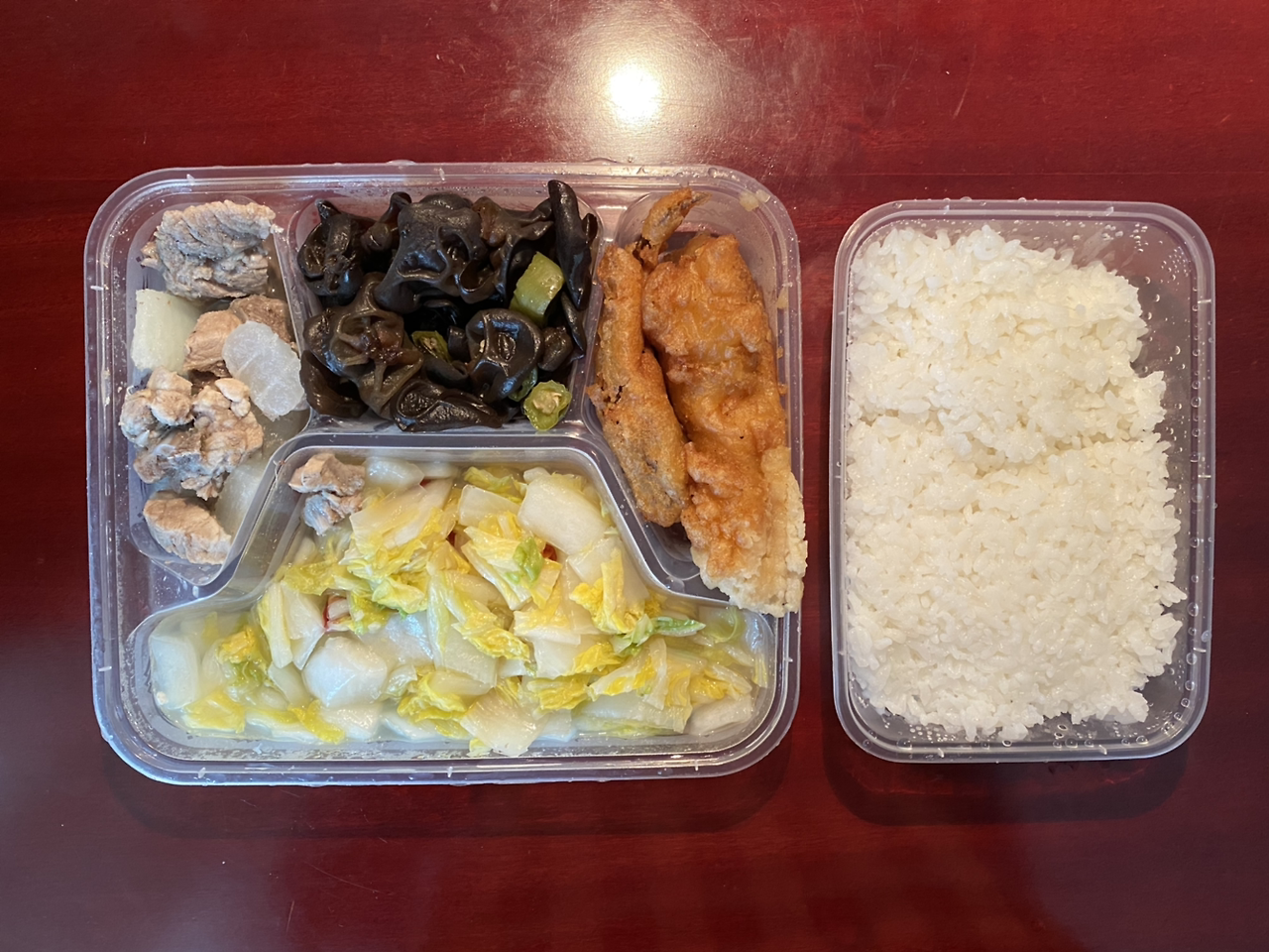 2) 점심: 치킨 비주얼로 잠시 나를 설레게 한 생선 튀김, 이름 모를 해조류 볶음, 배추 볶음, 푹 삶은 돼지고기 1/3 + 무 2/3