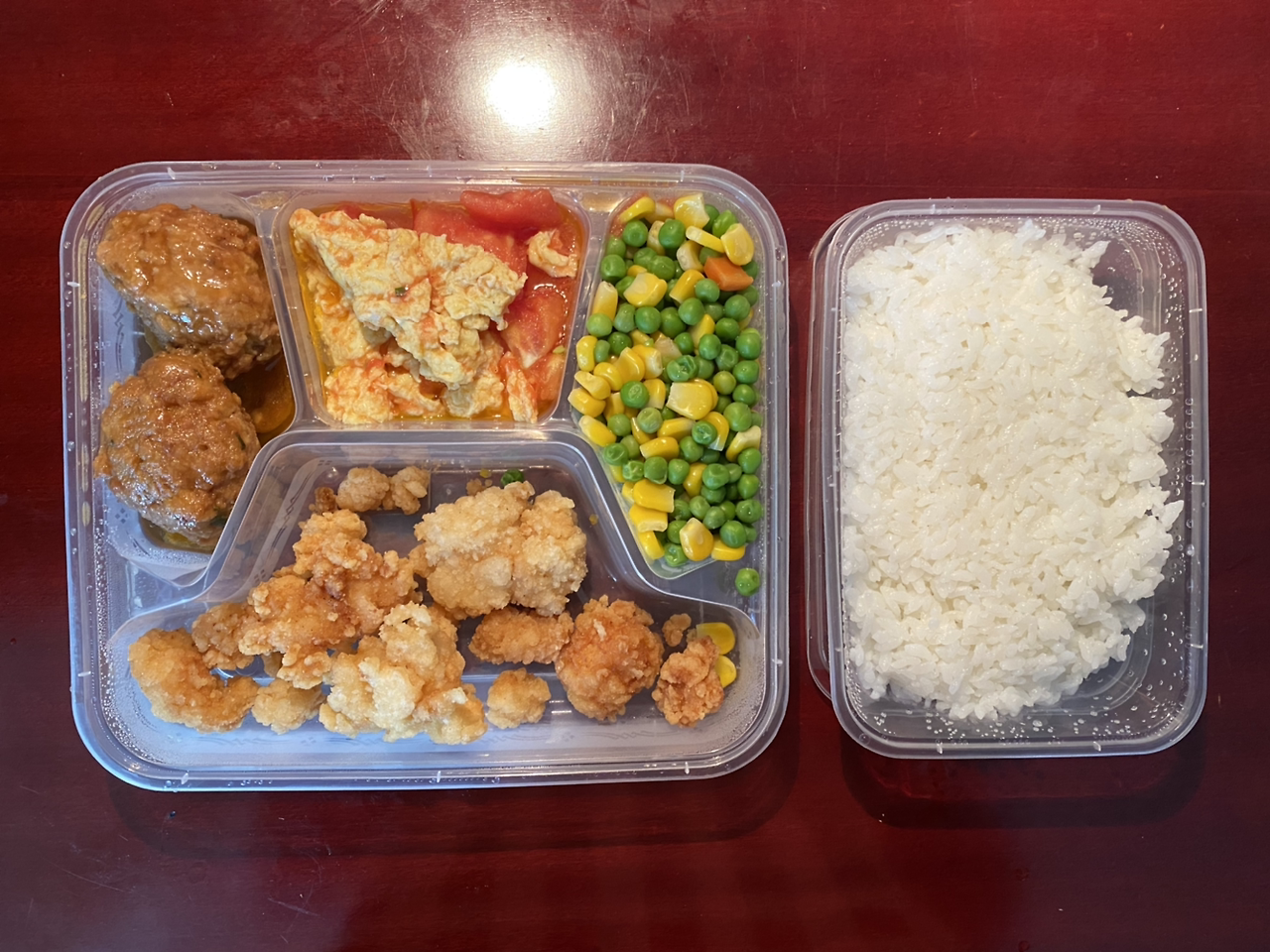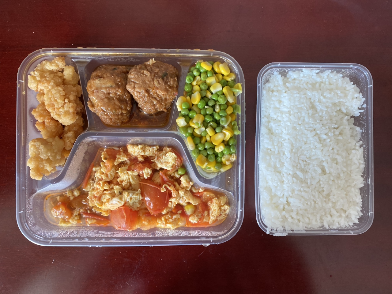 2) 점심: 중국식 소스 미트볼, 토마토 달걀 볶음, 고기튀김, 옥수수&완두콩 믹스 (별 5개 드립니다!)