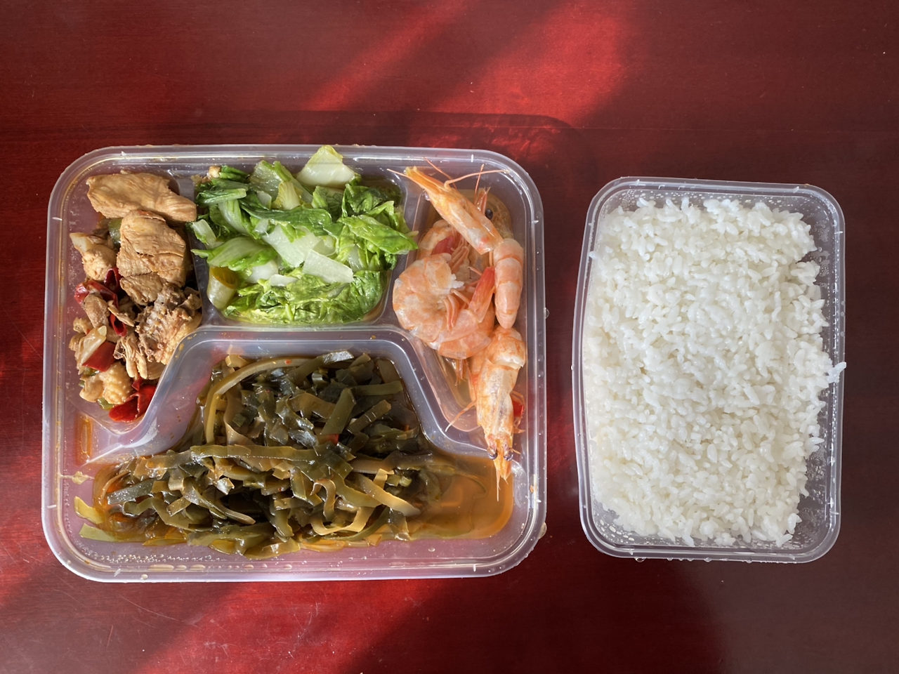 2) 점심: 새우, 미역볶음, 양념 닭고기, 야채