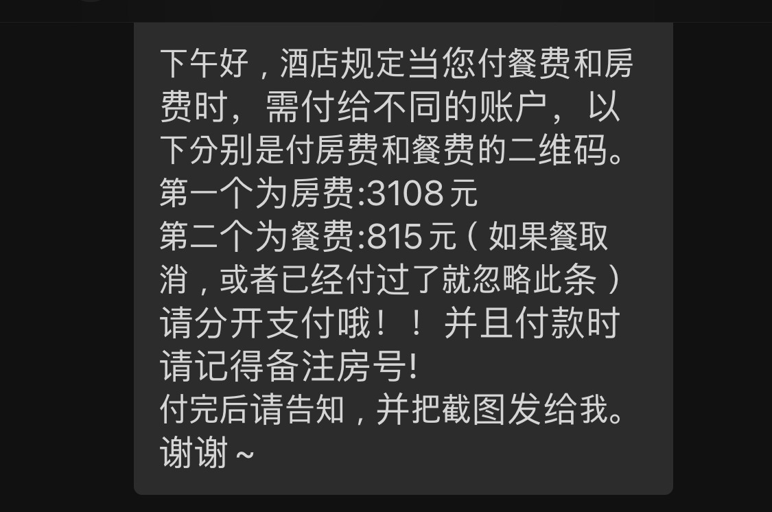 위챗페이로 숙박비랑 식비를 지불하라는 공지사항이다. 숙박비 3,108위안(52만 원), 식비 815위안(13.7만 원). 총합 66만 원이니 하루에 5만 원도 안 하는 저렴한 가격. 담당 직원이 바뀐 터라 다시 설명했다.