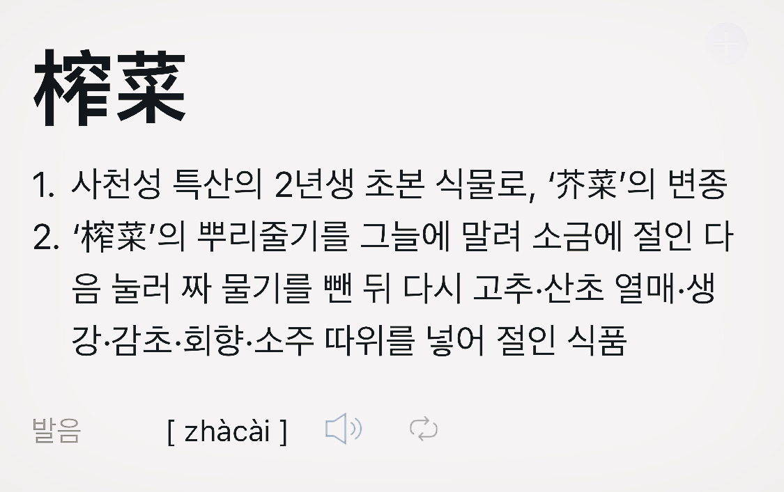 흠, 榨菜는 쓰촨 성 식물이고, 泡(pào)는 물에 담그다는 뜻이니 찻잎째로 물에 담그면 된다는 건가?