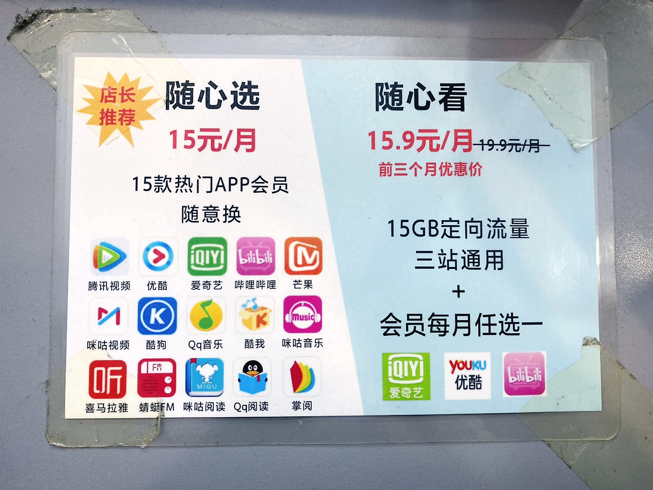 직원분이 신규 가입 고객은 월 구독료 15위안인 서비스가 3개월 동안 무료라고 매월 하나씩 어떤 서비스를 무료로 볼지 정할 수 있다고 안내해준다.