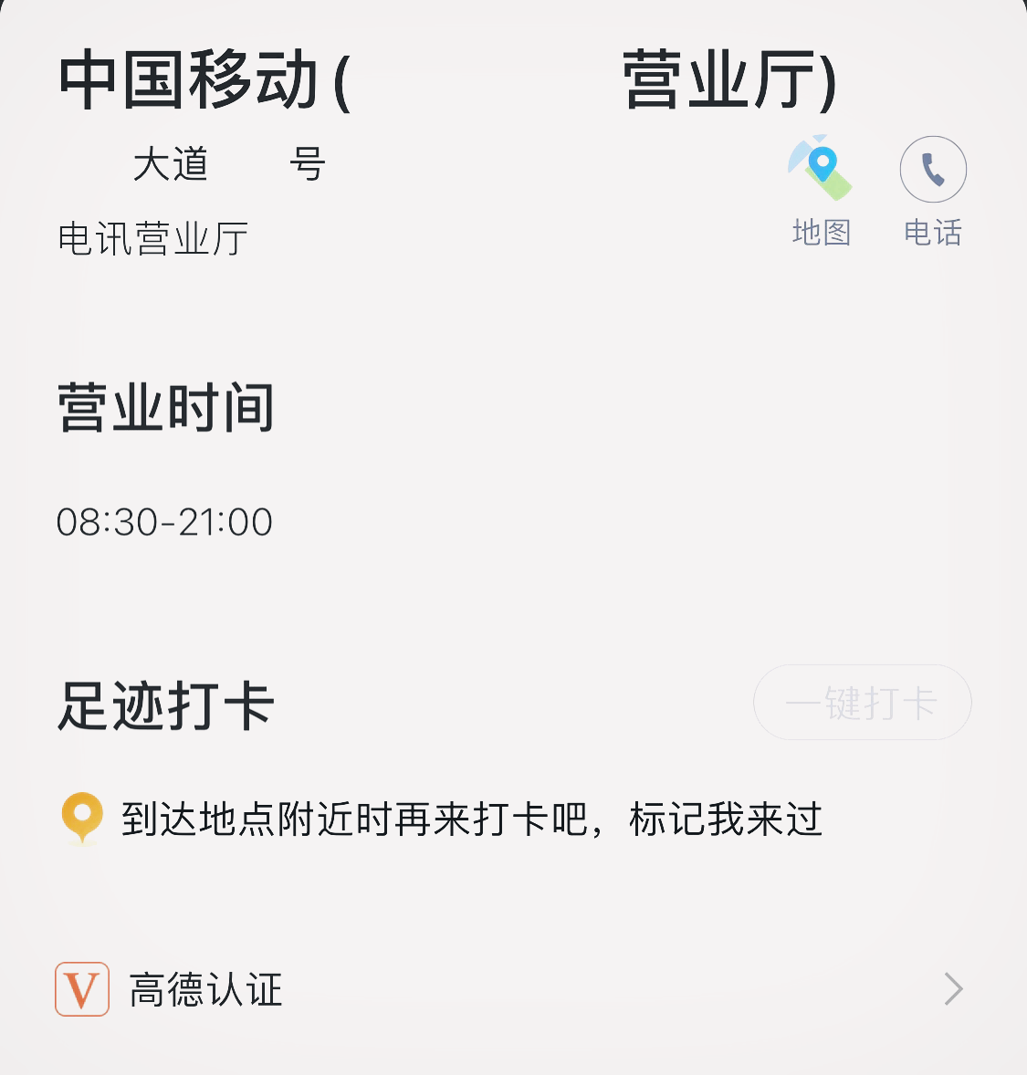 가오더 지도(高德地图)에서 종궈이동(中国移动)을 검색해 가장 가까운 지점을 찾았다. 영업시간이 나와있어 참고하기 좋다. 내가 가려는 지점은 매일 아침 8시 반부터 저녁 9시까지. 주말과 저녁에도 한다니 직원들은 힘들겠지만 고객 입장에서는 땡큐다.