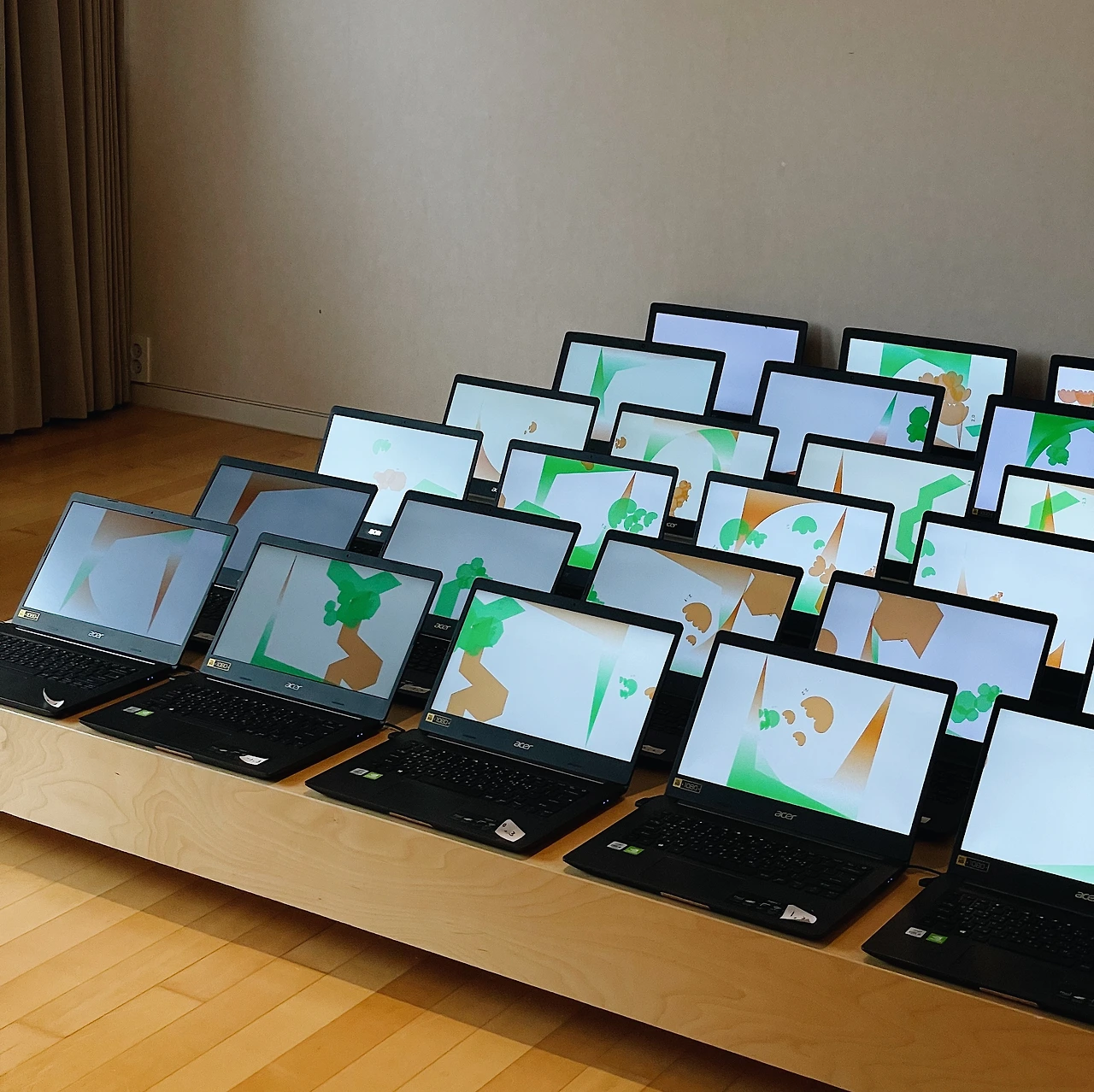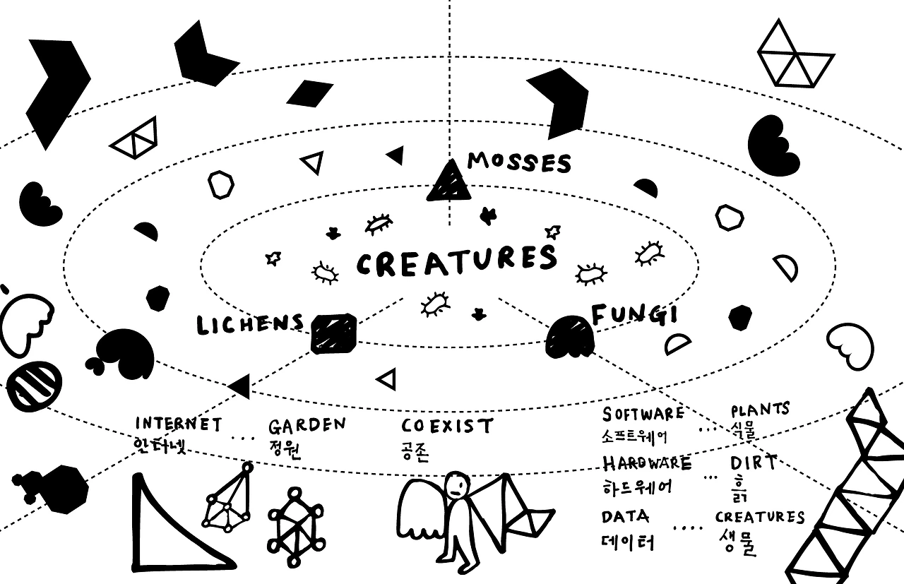 전시의 참여자 리스트를 본다. 웹 개발과 하드웨어 디자인 설계, 서버 엔지니어, 인터랙티브 웹 모션을 담당하는 협업자들 사이에 최태윤 작가는 ‘정원사’의 역할을 맡았다. 서버와 하드웨어 사이에 정원사는 어떤 가든을 조성했을까. 소프트웨어를 식물로, 하드웨어를 흙으로, 데이터를 생물로 정의 내린 보안여관의 작은 방 안에서 34개의 컴퓨터가 분산된 동시에 연결된 정원을 만들어내고 있었다.