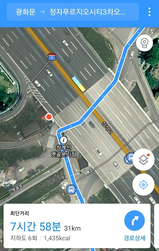 첫날의 목표 지점은 성남시 정자동에 있는 형의 집이었다. 광화문에서 출발해 서울을 빠져나와 첫날 당도하는 지점을 어디로 할까 고민해봤는데, 1번은 금천구 쪽으로 내려가 안양~군포 정도에 도착하는 루트, 2번은 과천 방향으로 내려가 마찬가지로 군포~의왕쯤에 도착하는, 그리고 3번은 청계산 자락을 지나 성남으로 가는 길, 마지막 4번은 잠실, 복정동을 지나 성남으로 빠지는 길이었다.