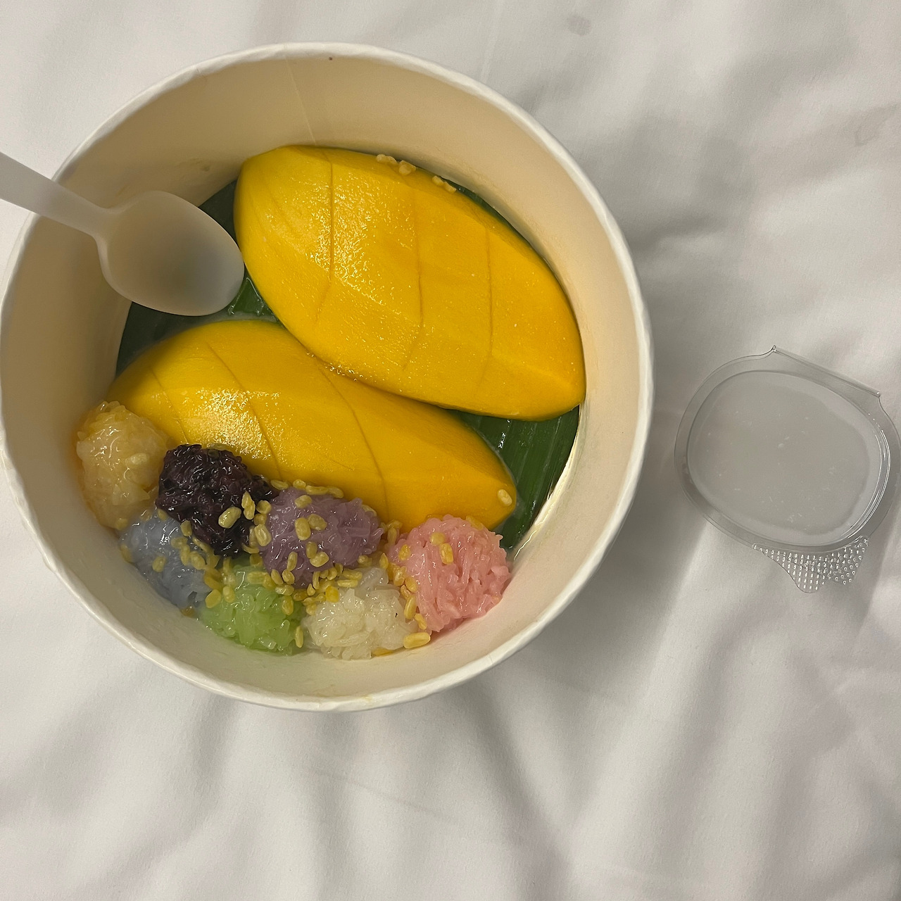 호텔 침대 위에서 조용히 망고와 찹쌀을 함께 떠먹고 있던 나는