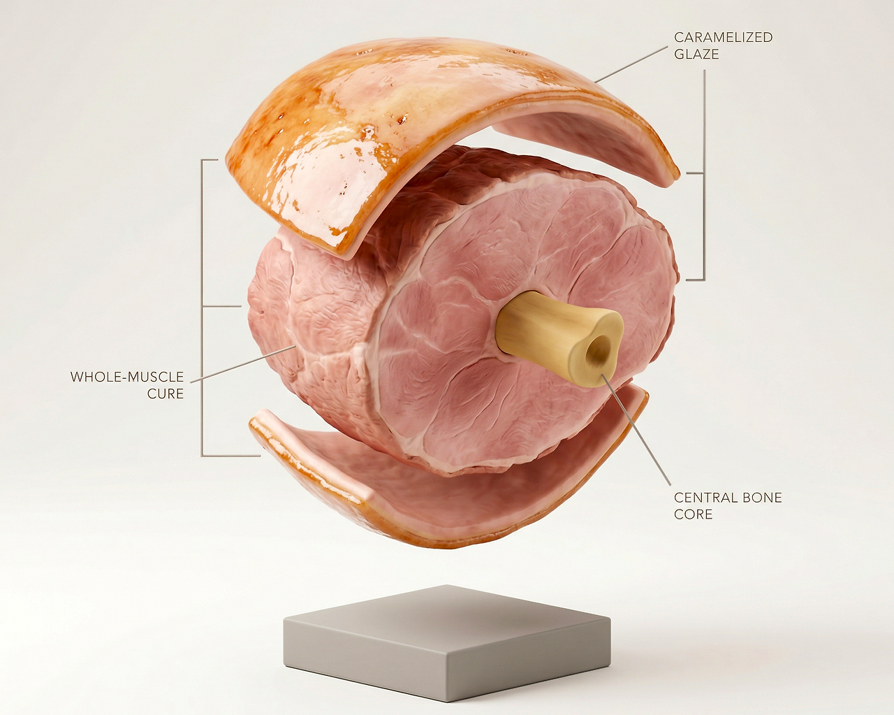 코어: 통근육 (돼지 뒷다리) 프로세스: 염지+훈연 표면: 당분 기반 글레이즈 출력: 대량 서빙+잔존 활용 가능
