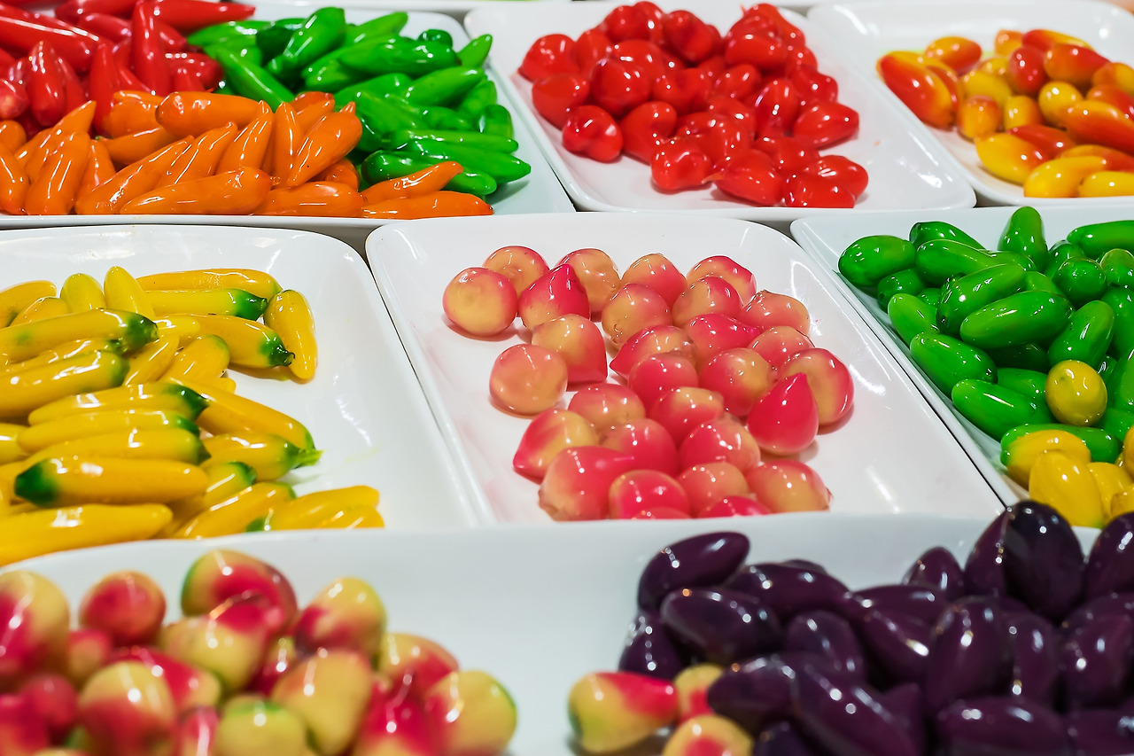 조금 더 걷자, 이번엔 더 정성스럽게 꾸며진 디저트 코너가 등장했다. 작은 고추 모양, 과일 모양을 본떠 알록달록하게 빚어낸 룩춥. 앙금을 동글게 말아 투명한 젤리로 코팅해놓은 모습은, 마치 비누나 플라스틱 장난감 같았다. 차마 먹기 아까울 정도로 예뻤다.