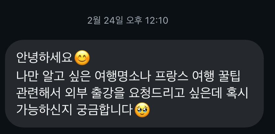 '나만 알고 싶은 여행명소나 프랑스 여행 꿀팁 관련해서 외부 출강을 요청드리고 싶은데 혹시 가능한지 궁금합니다.'