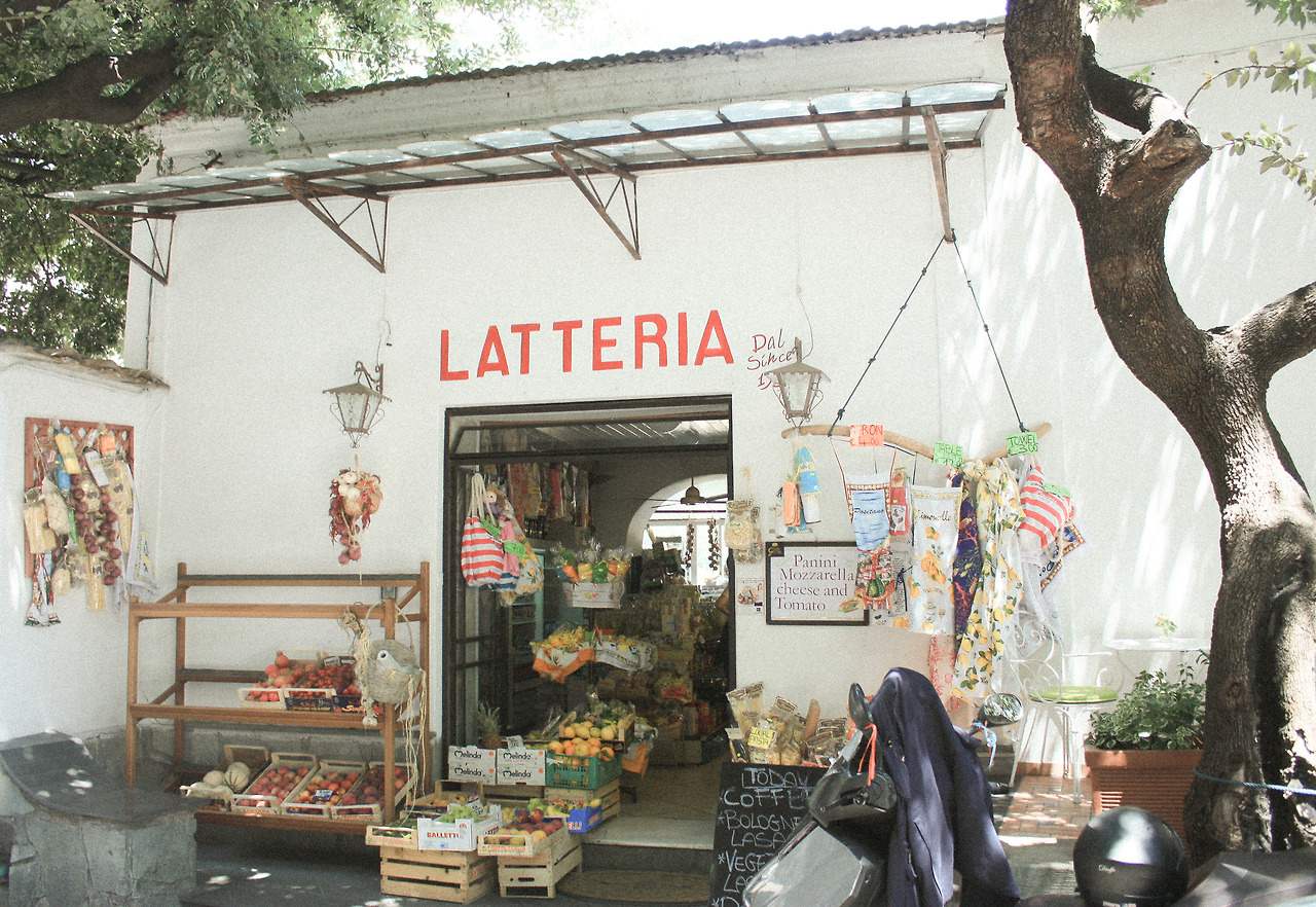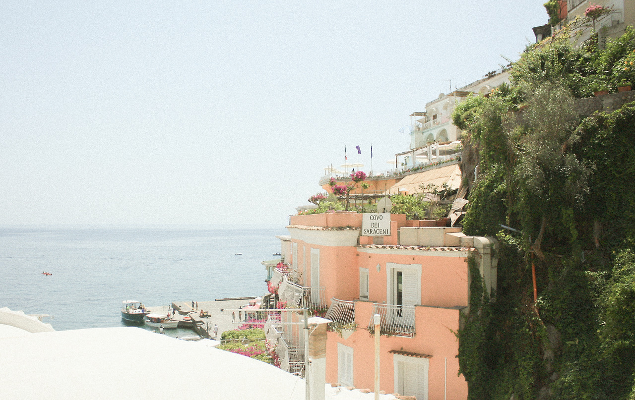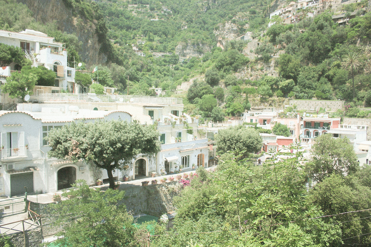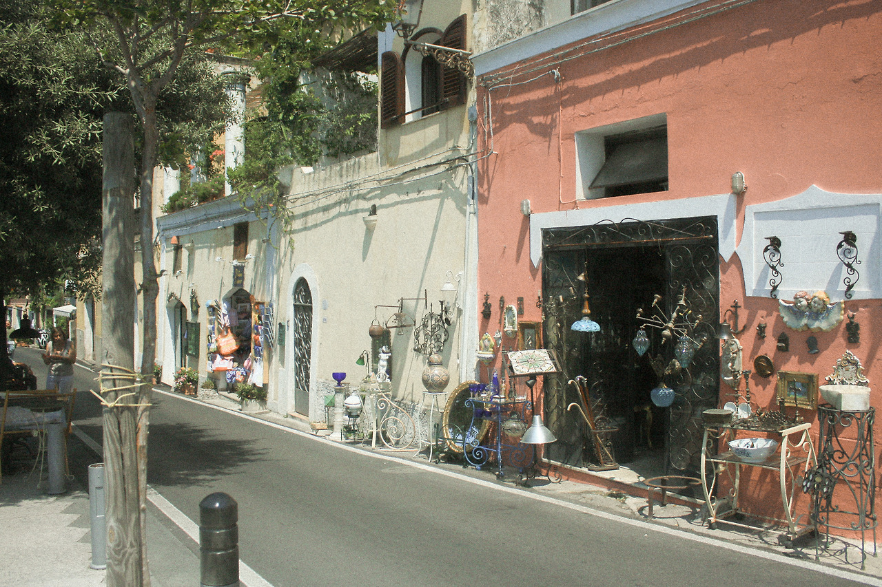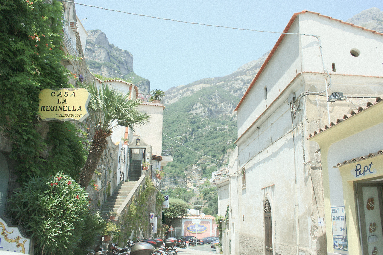 그렇게 나는 포지타노의 마을 가장 꼭대기 호텔에서 출발하여 가장 아래 해변에 도달하는 것을 목표로 걸어가기 시작했고 '하나의' 길로 다 이어진 마을이라는 것을 알고 난 뒤로는 발걸음에 제법 자신감이 생겼다. 포지타노의 위쪽은 사람이 거의 없고 조용하며 그늘이 거의 없어 온통 환하다. 아래로 내려가는 길은 차가 한대만 겨우 지나갈 정도의 좁은 길이지만, 한쪽에는 파스텔톤의 절벽 마을이 계속 한눈에 보이고 다른 한쪽은 아기자기하면서도 이국적인 상점과 집들이 들어서 있어서 앞만 보며 걸을 수도, 빨리 걸을 수 없는 온 마을을 잇는 그런 매력적인 길이다.