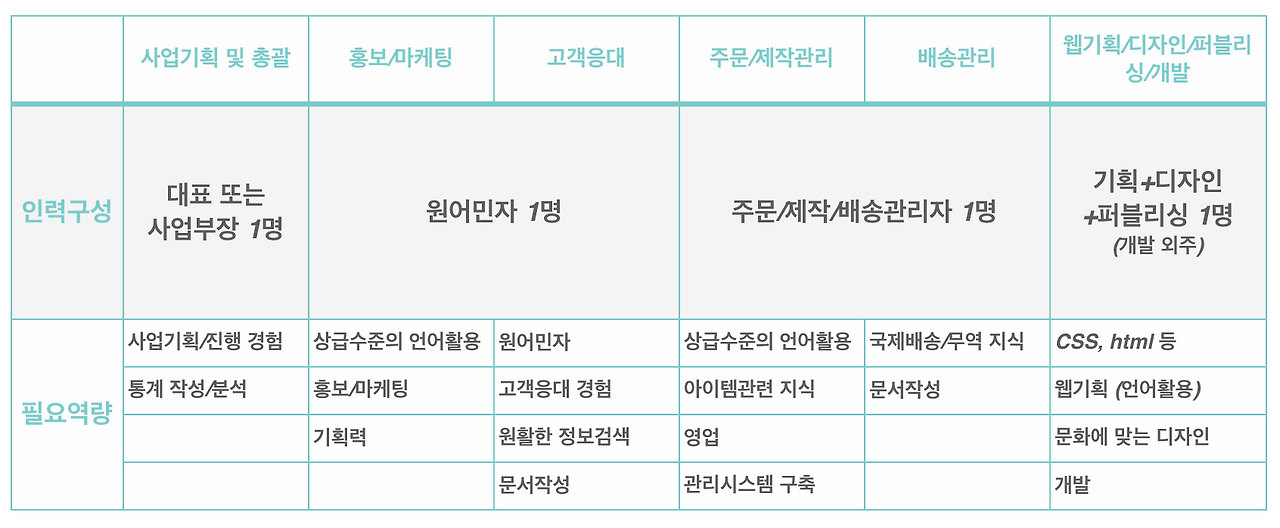 독립몰 해외직판사업을 진행하고자 마음먹었다면, 가장 먼저 조직 구성부터 계획하기를 추천한다. 물론, 채용 순서 및 업무 시작 시점은 사업기획 및 쇼핑몰 구축기간을 참고하여 계획하면 된다.