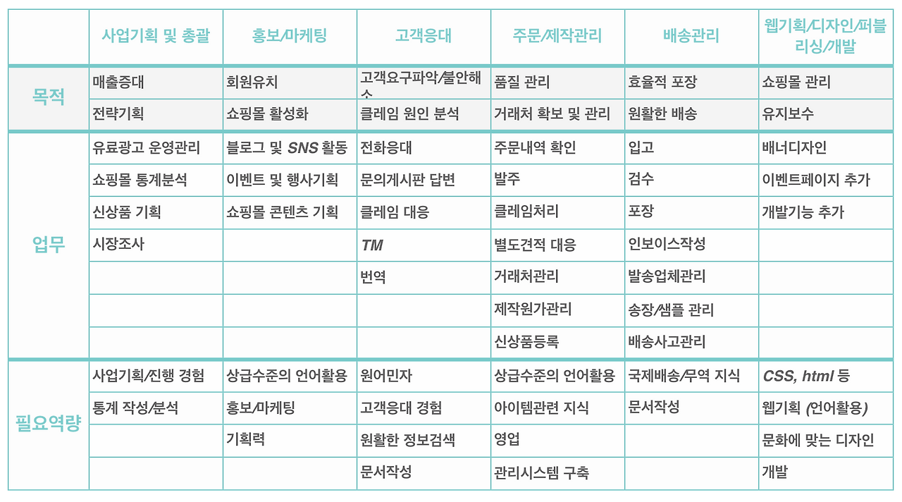 독립몰 해외직판은 일반적인 쇼핑몰과는 조금 다른 능력들을 필요로 합니다. 중요한 건 일반화되어 있는 지식이나 경험들이 아니라는 사실이다. 독립몰 해외직판은 새로운 시장에서 새로운 경쟁자들과 경쟁하며 새로운 유통경로를 만들어가는 과정이다. 또한 문화가 전혀 다른 곳에 사는 이들을 회원으로 끌고 들어와야 하기 때문에 새로운 문화와 시장의 성격에 대해 담당자들이 알고 적응해 나가는 것도 중요하다. 따라서 가장 좋은 인재는 끊임없이 학습하고 성장하며 변화를 추구할 줄 아는 사람이다. 이런 사람은 어느 곳에서도 중요한 사람이 되겠지만 독립몰 해외직판사업을 진행할 경우 꼭 필요한 사람이 된다.
