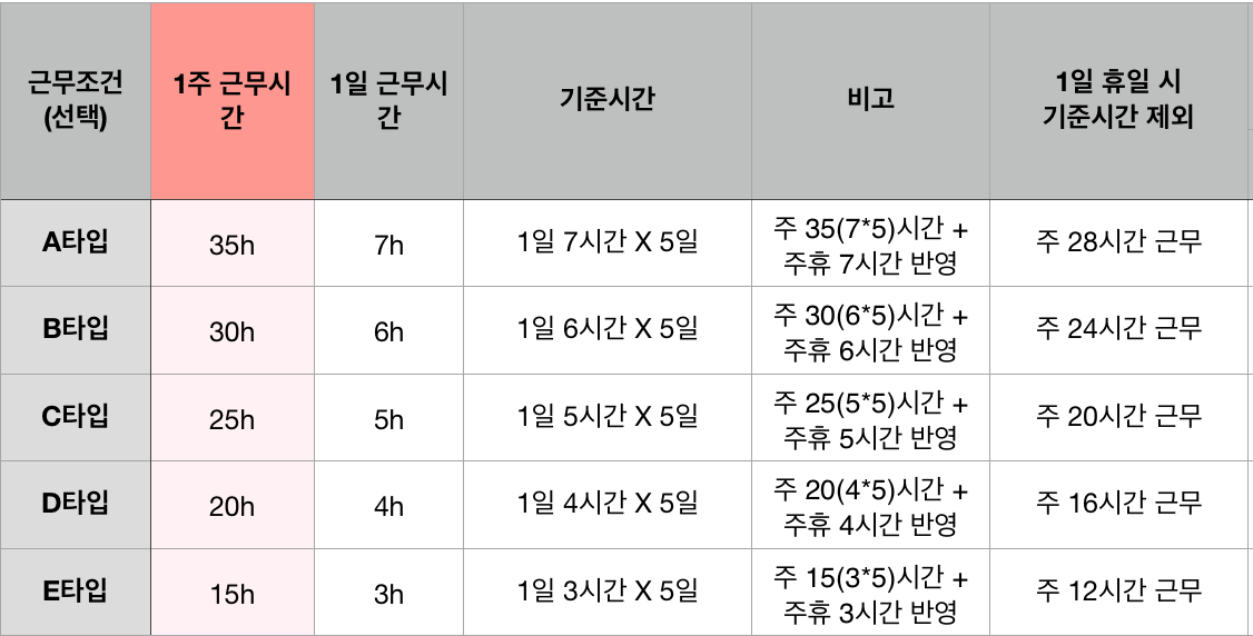근무조건을 타입별로 구성하고 선택하도록 하였다. 1일 근무시간의 기준은 급여 계산을 위해서만 사용되고, 1일 근무시간을 굳이 지키지 않아도 된다. 하루 꼬박 밤을 새워서 일을 하고 며칠을 놀아도 된다. 출퇴근 버튼을 누르는 것도, 외출 버튼을 누르는 것도 혼자 집에서 또는 자신이 선택한 근무장소에서 편하게 누르면 된다. 근무시간을 못 채울 듯한 주가 있다면 연차를 당일에 써도 괜찮다.