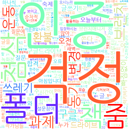 어느 단어가 눈에 들어오시나요? 대화방 문장들을 분석해 보니 '걱정'이 압도적 1위를 차지했더라고요. 맞아요. 시작은 걱정과 설렘의 두 얼굴을 가지고 있으니까요. 뒤이어 인증, 폴더, 첨삭, 브런치, 책, 줌이 보이고 아, 환불도 당당히 자리를 차지하고 있네요. 단어들만 봐도 동기 작가님들과 나눴던 대화 내용들, 줌 수업이 퐁퐁 떠올라 드라마 다시 보기 하는 기분이 들더라고요.