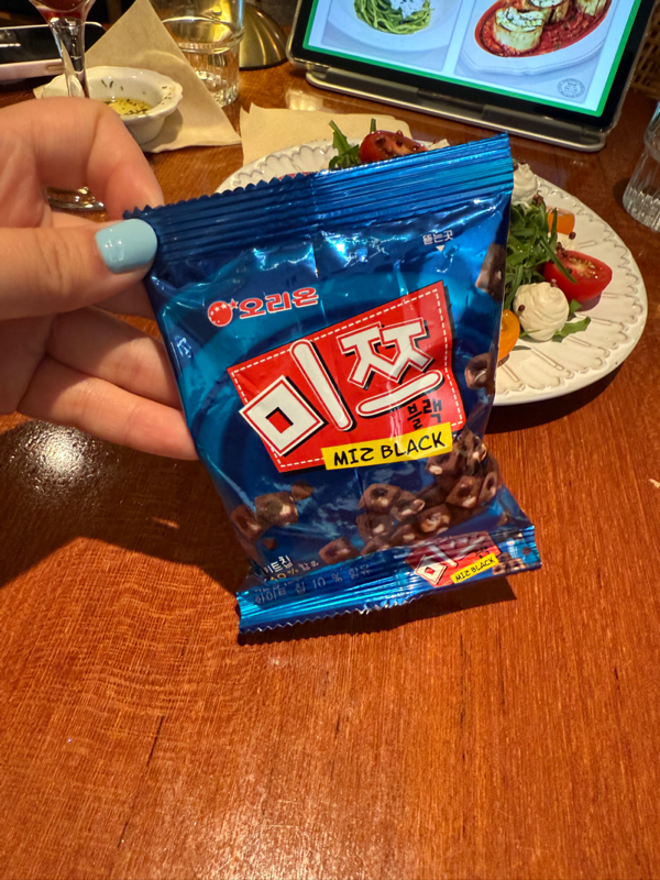 딸이 잠깐만 기다려보라면서 제일 좋아하는 손바닥만 한 과자 한 봉지를 가져온다