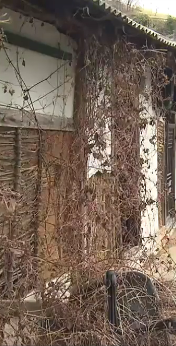 흰 비닐로 입을 봉한 낡은 나무 대문이 열린다.