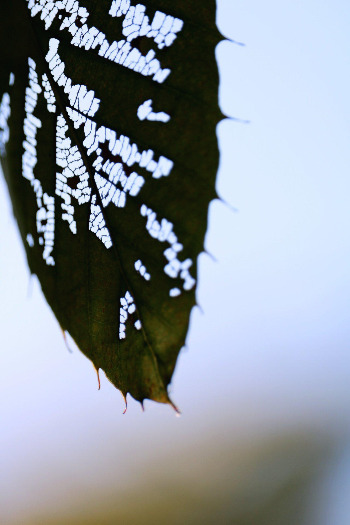 벌레가 나뭇잎을 야금야금 베어내 길을 내고 있습니다.