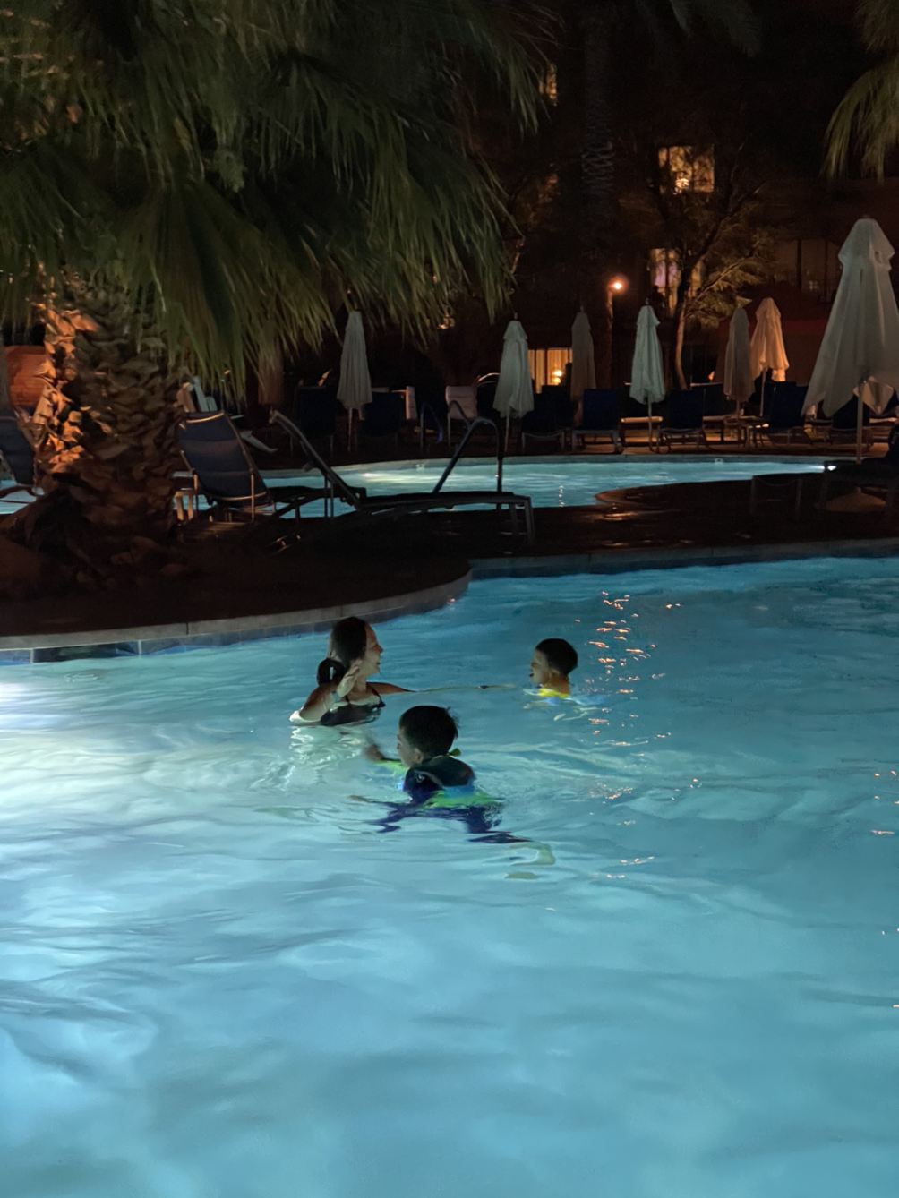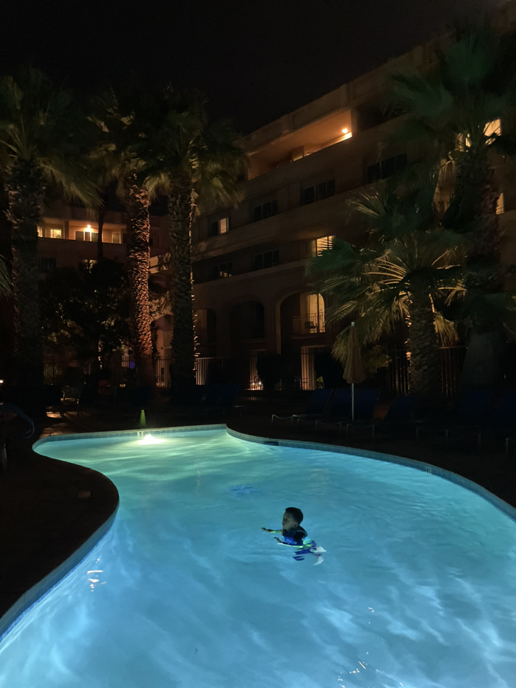 11월 중순인데도 팜스프링스의 온도는 낮 최고기온 26도였다. 수영을 하기에 살짝 춥기는 했지만 수영장 물이 따뜻해서 그나마 괜찮았다. 호텔 체크인을 오후 5시에야 하고서 룸에 들어가 저녁까지 먹으니, 시각은 오후 7시. 이 밤의 끝을 붙잡고자 야간 수영을 하러 나갔다. 호텔 테라스에서 바로 수영장으로 진입이 가능해서 편했다. 수영장에서 물 만난 물고기가 된 아이들. 5살, 2살 짜리 아이들은 서로 붙잡기 놀이를 하며 꺄르르 웃었다. 밤 수영이라 다행히 수영장에 우리 밖에 없어서 마치 단독 빌라 수영장을 쓰는 것 같았다. 덕분에 코로나19 걱정도 피할 수 있었고.