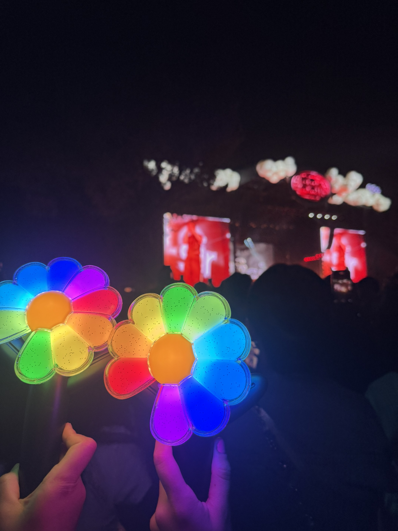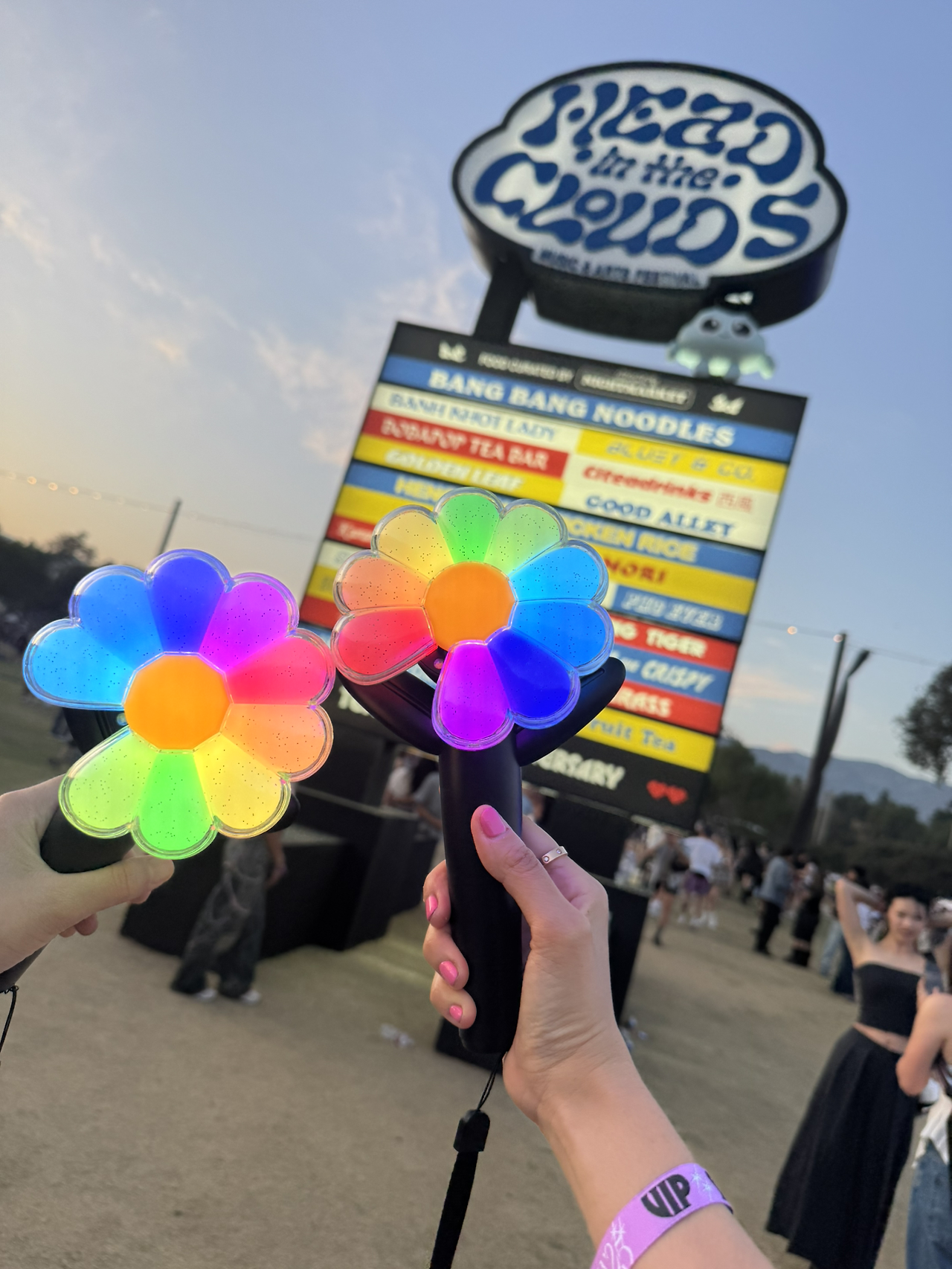 지드래곤은 그날 맨 마지막 순서인 오후 10시쯤에 등장할 예정이었다. 친구와 나는 더운날 무리하지 말고, 느지막히 만나자는 약속을 잡았다. 오후 7시쯤 집을 나와 친구와 7시40분쯤 만났다. 친구와 나도 늦게까지 공연을 즐기기 위해 낮잠을 푹 자고온 상태라 뽀송뽀송했다. 친구는 6개월차에 접어든 임산부였는데, 지드래곤 팬도 아니면서 날 위해 기꺼이 공연장에 동행을 해줬다. 지드래곤 신곡을 예습해왔다는 친구... 게다가 전세계적으로 품절됐다는 새로 나온 꽃 응원봉까지 야무지게 구해왔다.