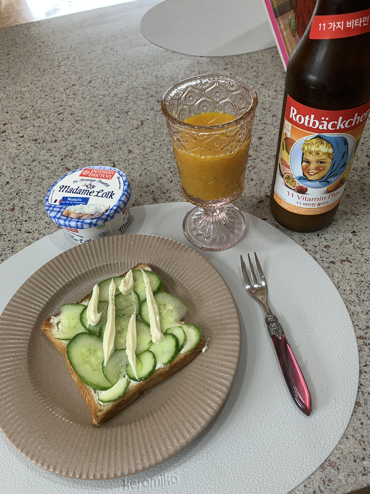 음악을 들으며 오렌지 주스 한잔을 마시고 있다 보면 아들도 잠에서 깨서 밖으로 나온다. 뭐 먹을래, 물으나 마나 늘 그렇듯 식빵을 버터에 굽는다. 아이는 초코 크림, 나는 크림치즈에 오이를 올려 냠- 한 입 베어 문다.