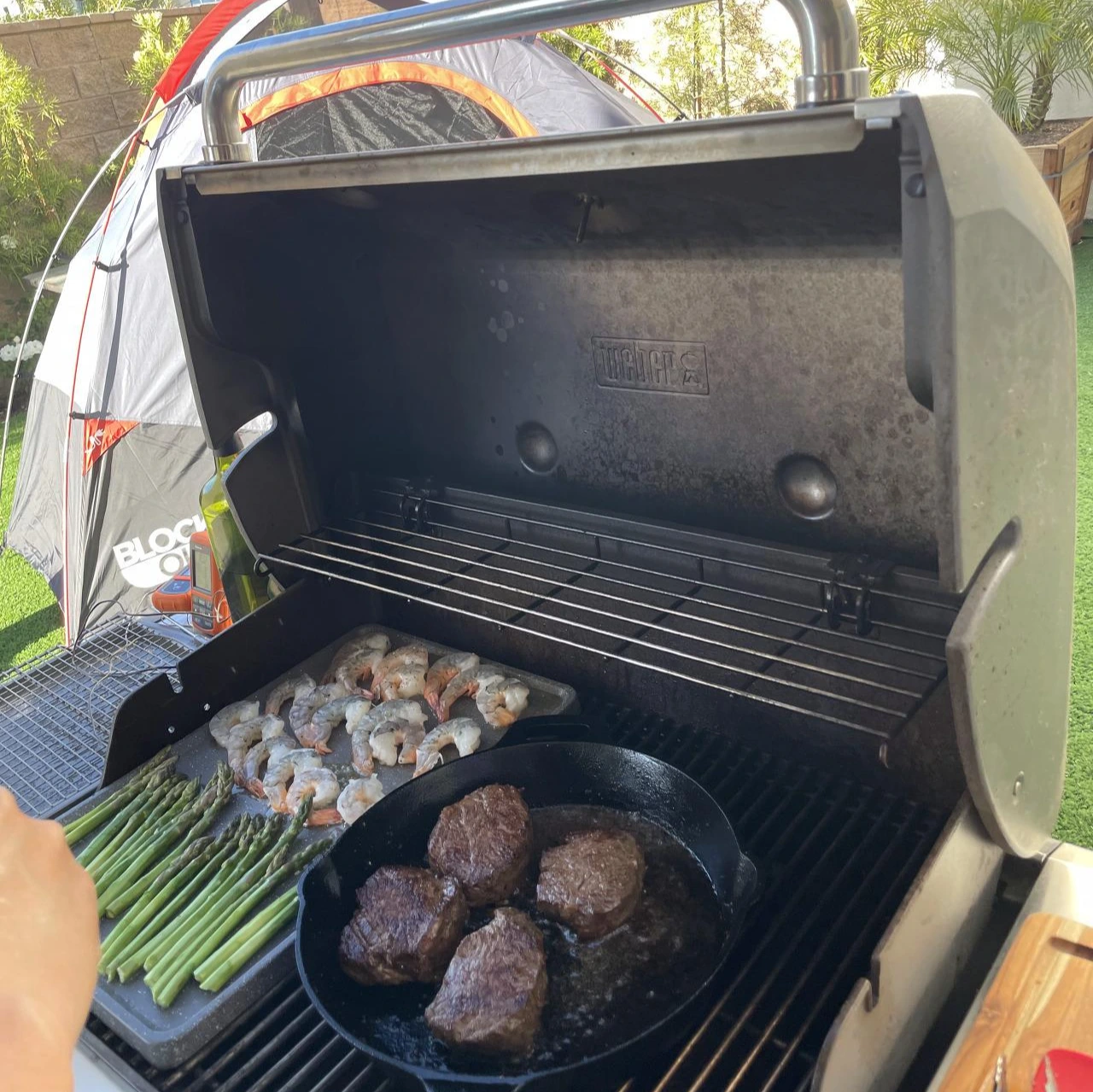 텐트를 사오는 길에 남편은 스테이크로 먹을 등심과 해산물까지 장을 봐왔다. 평소에도 매주 주말마다 야외에서 스테이크를 구워먹는 일은 허다했지만, 텐트를 설치한 후 고기를 구우니 이곳이 캠핑장? 이라는 묘한 착각이 들었다. 분명한 건 기분 좋은 착각이었다. 설렘을 동반한.