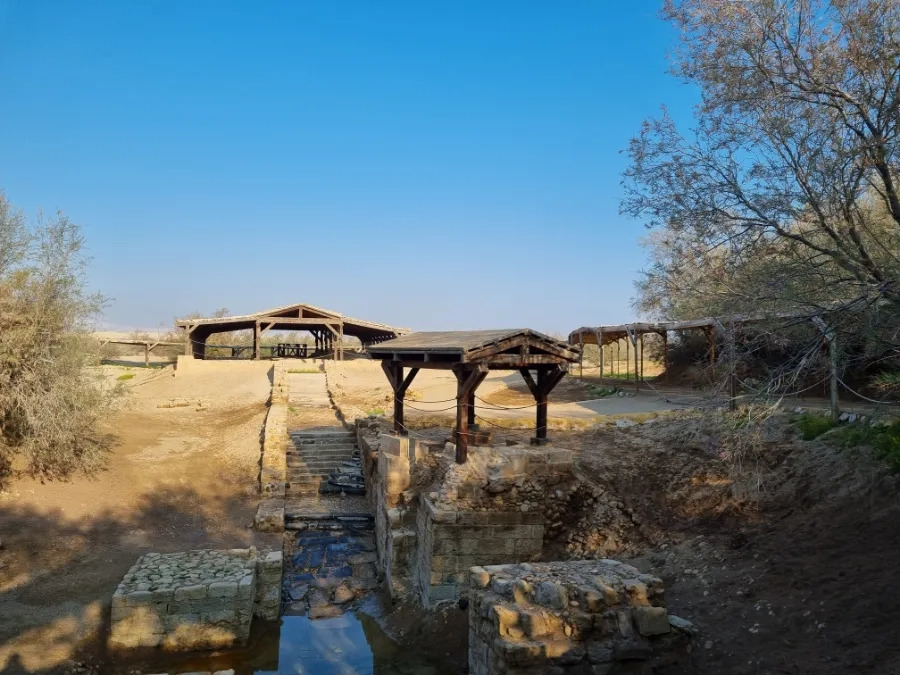 건물 몇 개를 본 다음 한 공터에서 내려 기념품 가게이자 역사적 물품이 몇 점 남아있는 건물로 들어갔다. 일부 기념품에는 팔레스타인산(Made in Palestine)이라는 문구가 새겨져 있거나, 스티커가 붙어있기도 했다. 빈 손으로 건물을 나와 바깥을 구경하다, 가이드를 따라 공사 중인 오솔길을 걸었다. 조금 걸으니 오래된 목조 건물이 나왔는데 가이드가 사진을 찍을 시간을 준다. 어떤 곳인가 하니 그곳이 바로 예수님 세례터였다. 오래전에는 물이 가득 차 있었다는데 지금은 물이 메말라 바닥이 보일 정도였다. 기원전 2-3세기 순례 기록이 남아있는 곳인 데다가 유네스코 문화유산으로 지정된 곳으로 매우 중요한 장소이다. 그래서인지 2014년 방문했다는 프란치스코 교황과 국왕 가족의 모자이크 작품도 보였다. 모자이크 작품은 없었지만 2000년에는 요한 바오로 2세, 2009년에는 베네딕토 16세도 방문했다고 한다. 가톨릭 교황이 무려 3명이나 방문한 곳이다. 세례터와 수도원 잔해를 본 뒤 요단강으로 향했다.