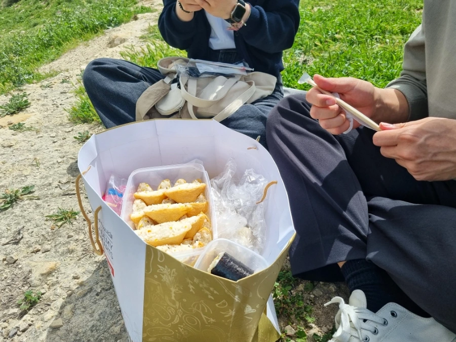 기사님의 "도착했어요."라는 말에 미리 만들어온 소풍 도시락을 꺼내서 2시간 만에 제대로 된 바깥공기를 맡았다. 우리 셋은 눈앞에 보이는 호수를 흐린 눈으로 바라보며 "트레킹 하기 좋은 멋진 호수가 어디 있을까요?" 하며 두리번거렸다. 구글 지도를 다시 켜서 확인하니 우리 바로 앞의 호수가 아라이스 호수였다. 석촌호수의 1/8? 1/10 크기의 작은 호수였다. 요르단에서 처음 본 호수와 오랜만에 본 초록빛의 향연을 즐기기 위해 양똥을 피해 신문지를 깔고 도시락을 꺼냈다. 김밥 속은 부실하고, 유부초밥 밥도 설익었지만 역시 야외에서 먹는 도시락은 꿀맛이었다. 트래킹코스라고 하여 좀 걷고 싶었지만 밥을 먹으며 물을 많이 마신 탓인지 화장실이 급했다. 우리가 지나왔던 길을 되짚어 보았는데 그 어떤 곳에도 화장실은 없었다. 꼬불꼬불한 길을 다시 나갈 생각을 하니 머릿속이 새하얗게 되었다. 그때까지 버틸 수 없을 것 같았다. 그 뒤의 이야기는 생략.