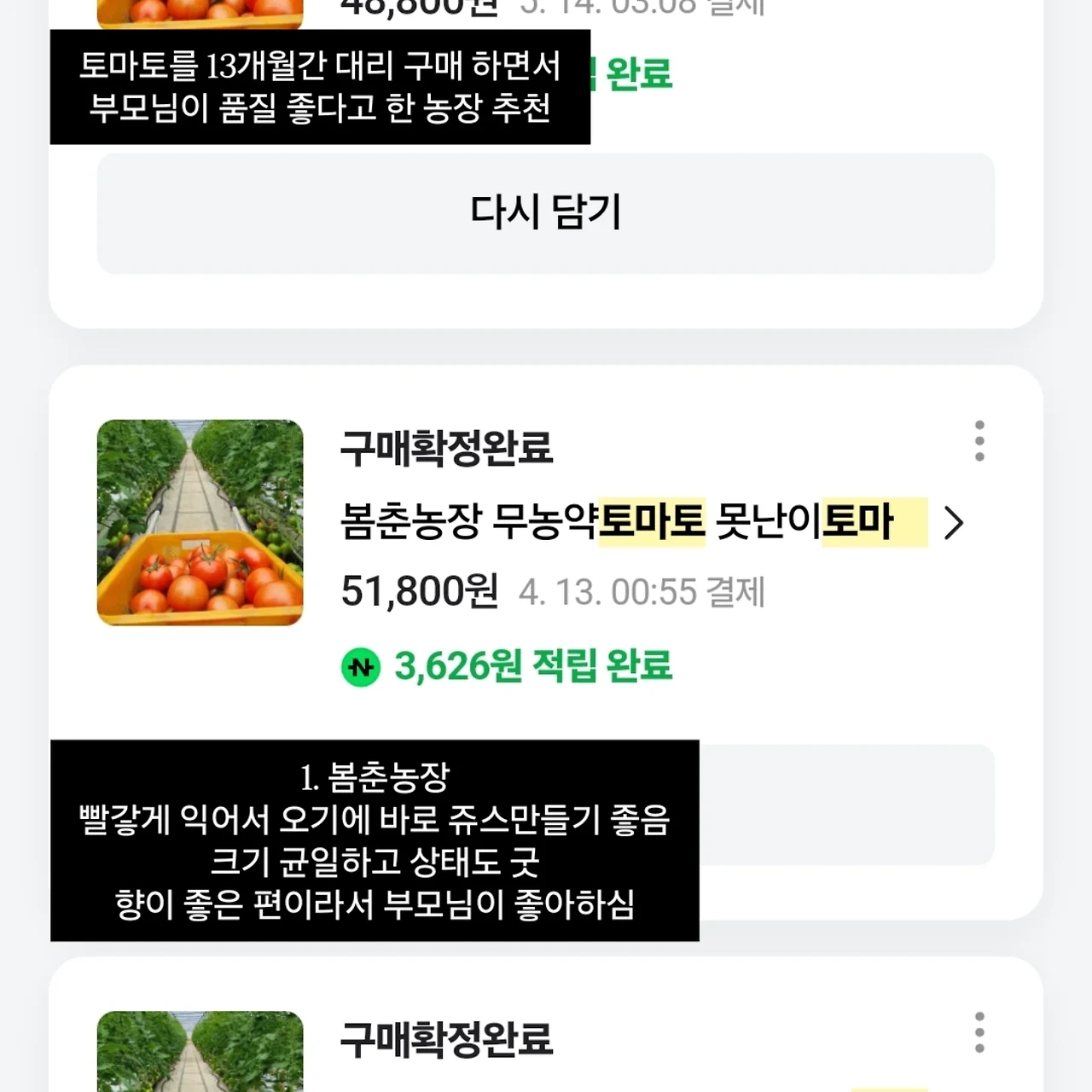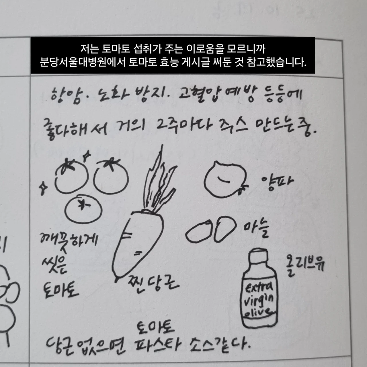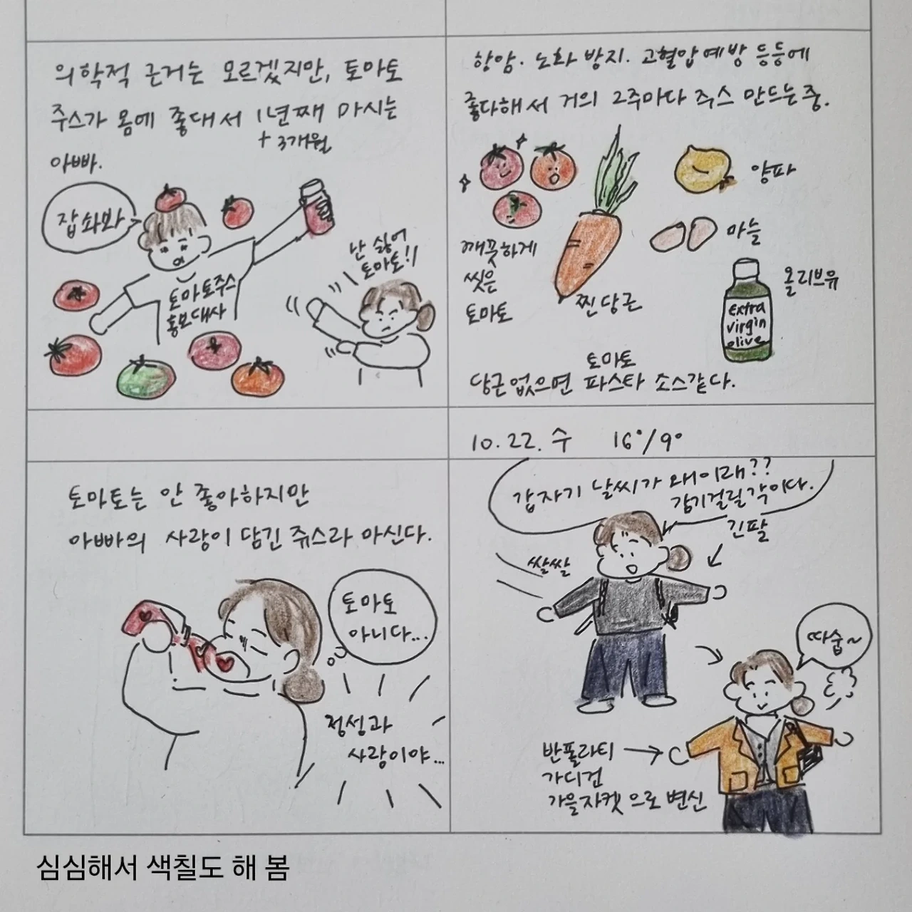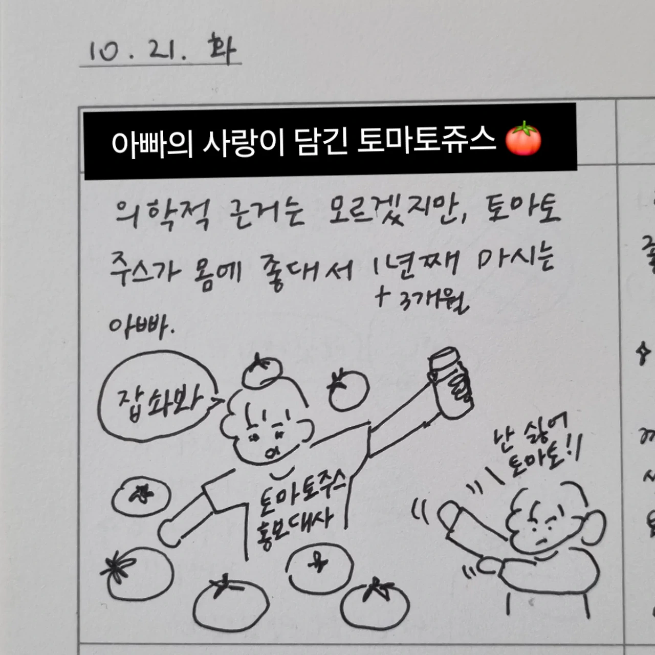 아빠의 토마토 주스 제조는 1년 3개월 전으로 올라간다. 수술 이후 토마토가 좋다해서 마시게 되었다. 나도 비염이 심한 편인데, 체내 염증이 많은 것이 원인이라고 생각하여 같이 먹자고 하여 마시는 중이다. (나는 토마토를 싫어한다) 하지만 아빠의 사랑과 정성이 담긴 토마토라서 열심히 먹으려 노력하고 있다.