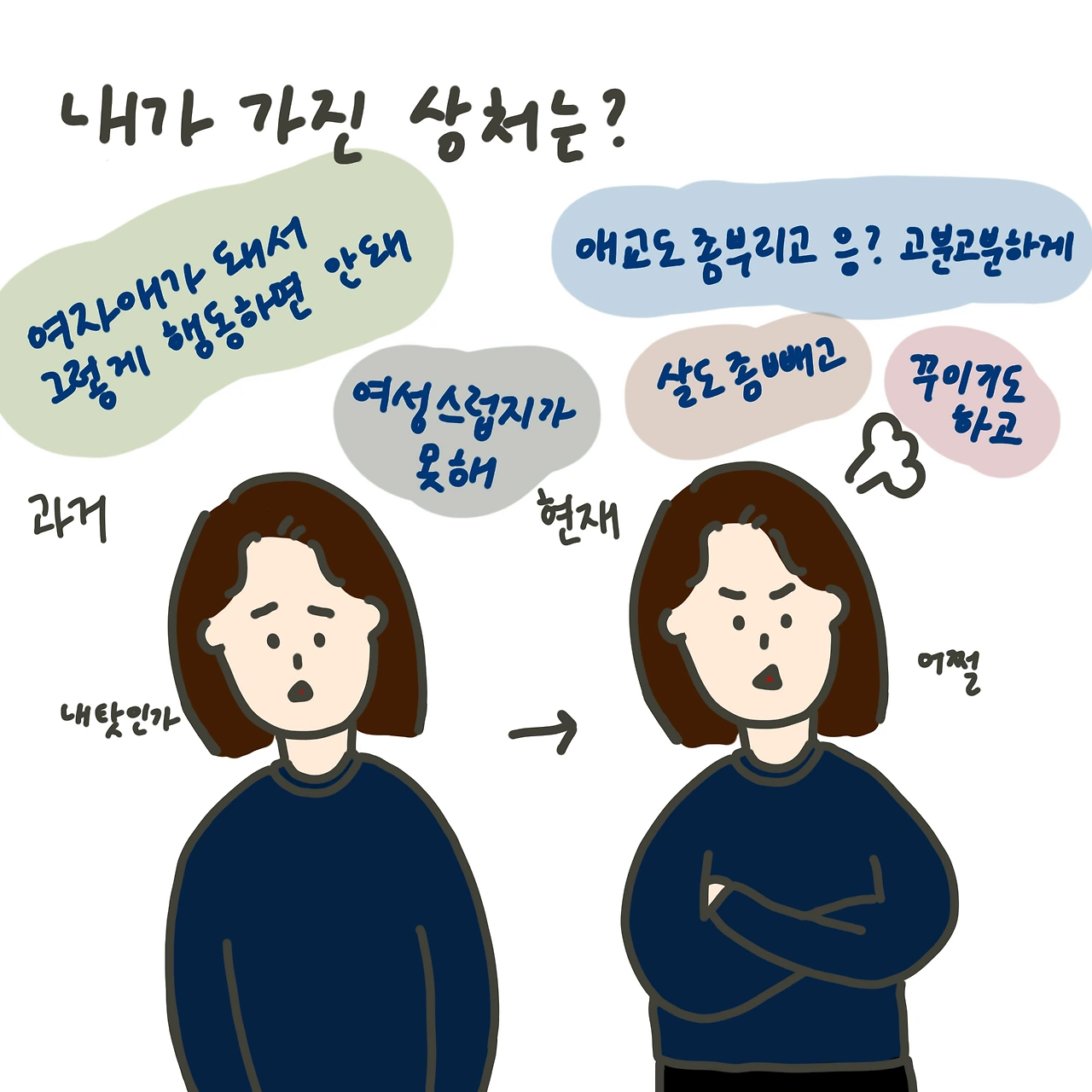 나는 할머니에게 상처 받았지만 한편으론 할머니 역시 피해자였다는 생각을 지울 수 없다. 누군가 할머니에게 쭉 주입했을 '여자니까, 여자라서...'와 같은 문장들. 너무나 당연해서 손녀에게도 말했을 그 문장들. 나는 그때 삐뚤어진 행동으로 할머니의 성질을 긁었지만(사실 지금도 그러고 있다) 약간의 후회는 한다. 그때 거부했던 모든 것들로 인해 지금의 성격이 만들어진 것 같아서. 지금의 내 성격이 불완전하던 어렸던 나의 과오로 빚어진 게 아닌가 해서.