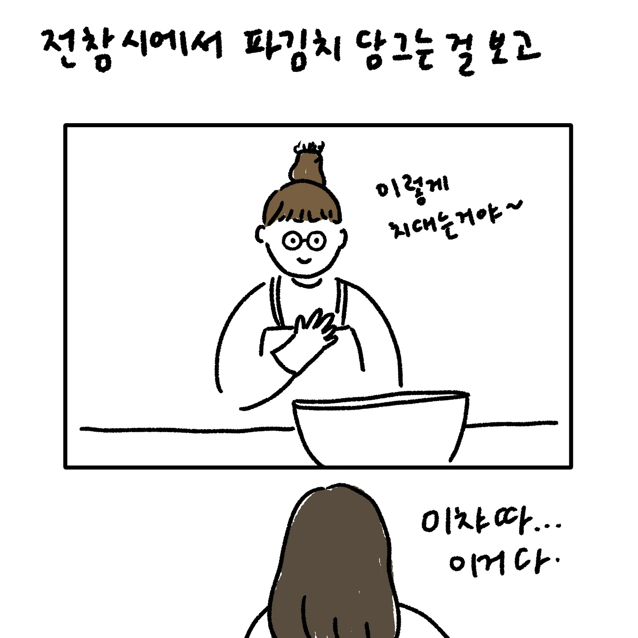 유튜브 알고리즘은 무섭다. 내가 한 번 봤던 채널이 내 기억에서 사라질 즈음 주기적으로 틀어준다. 여느 때처럼 밥친구로 태블릿을 식탁 위로 데려 왔다. 숟가락으로 밥을 한 술 뜨며 유튜브가 추천해준 영상을 눌렀다. 전지적 참견 시점(이하 전참시)에서 이영자와 그의 매니저 그리고 전현무가 홍현희네 집에 가기 전 준비를 하는 내용이었다. 이영자가 파김치를 담갔고 전현무가 정~말 맛있게 먹었다. 파김치 담자마자 먹고, 다른 것들로 배를 채워서 배가 부른데도 불구하고 '파김치'소리에 반응해 일어나 홀린 듯 파김치를 먹었다. 홀린 듯 파김치를 먹는 전현무가 나를 홀렸다. 어떻게든 파김치를 먹어야겠다는 생각이 머릿속을 가득 채웠다.