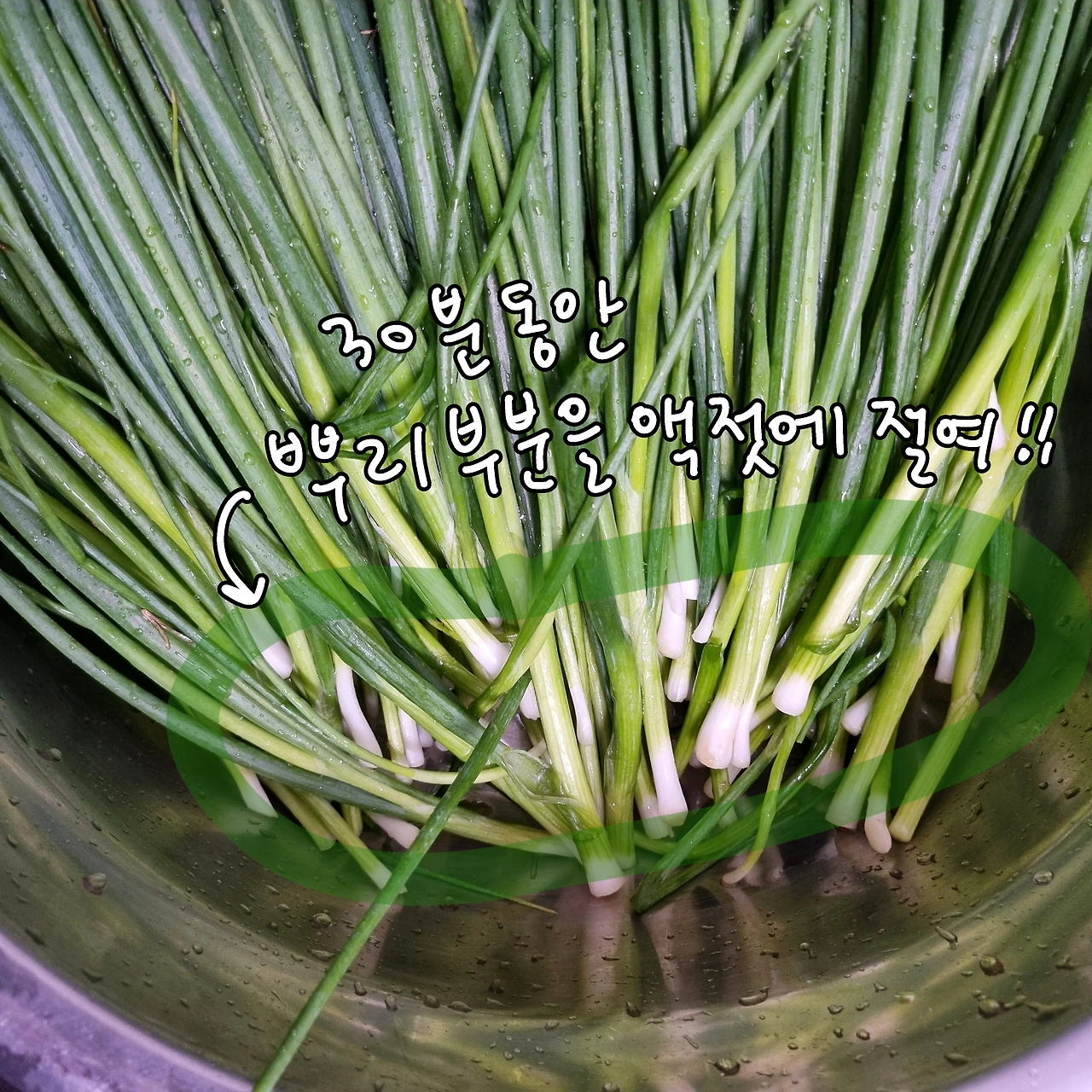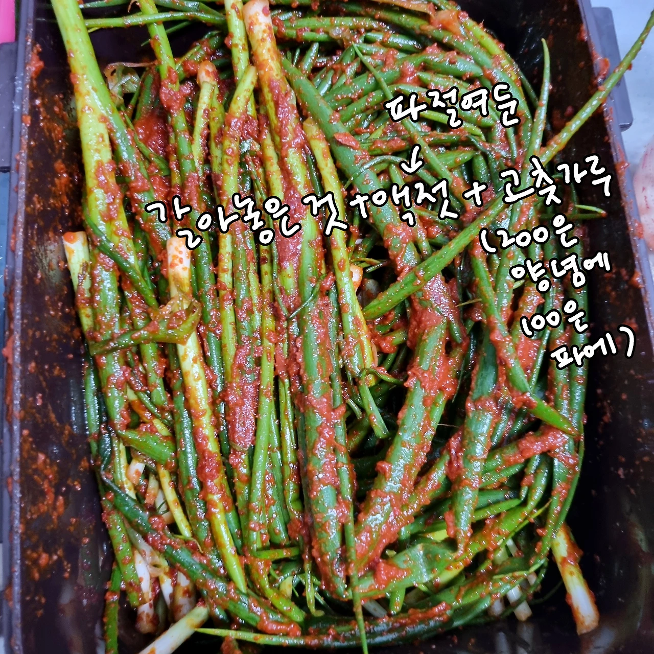 이영자 님이 알려준 재료를 갖추진 못했다. 꽃게 액젓이 없어서 조금 아쉬웠지만 급한 대로 까나리+멸치를 반반 섞어서 사용하기로 했다. 생각 없이 파를 샀는데 손질을 내가 해야 했다. 파 담그는 건 절이는 시간을 포함해도 한 시간이면 충분할 것 같은데 파 손질과 세척을 한 시간은 한 듯하다. 씻고 대충 물기를 제거한 후 반반 섞은 액젓에 파를 담가줬다. 파가 맛있게 절여지는 동안 양념을 갈아서 준비했다. 그리고 절인 파에 양념을 덕지덕지 발라~ 파김치가 뚝딱 완성되었다.(뚝딱은 아니었지만)