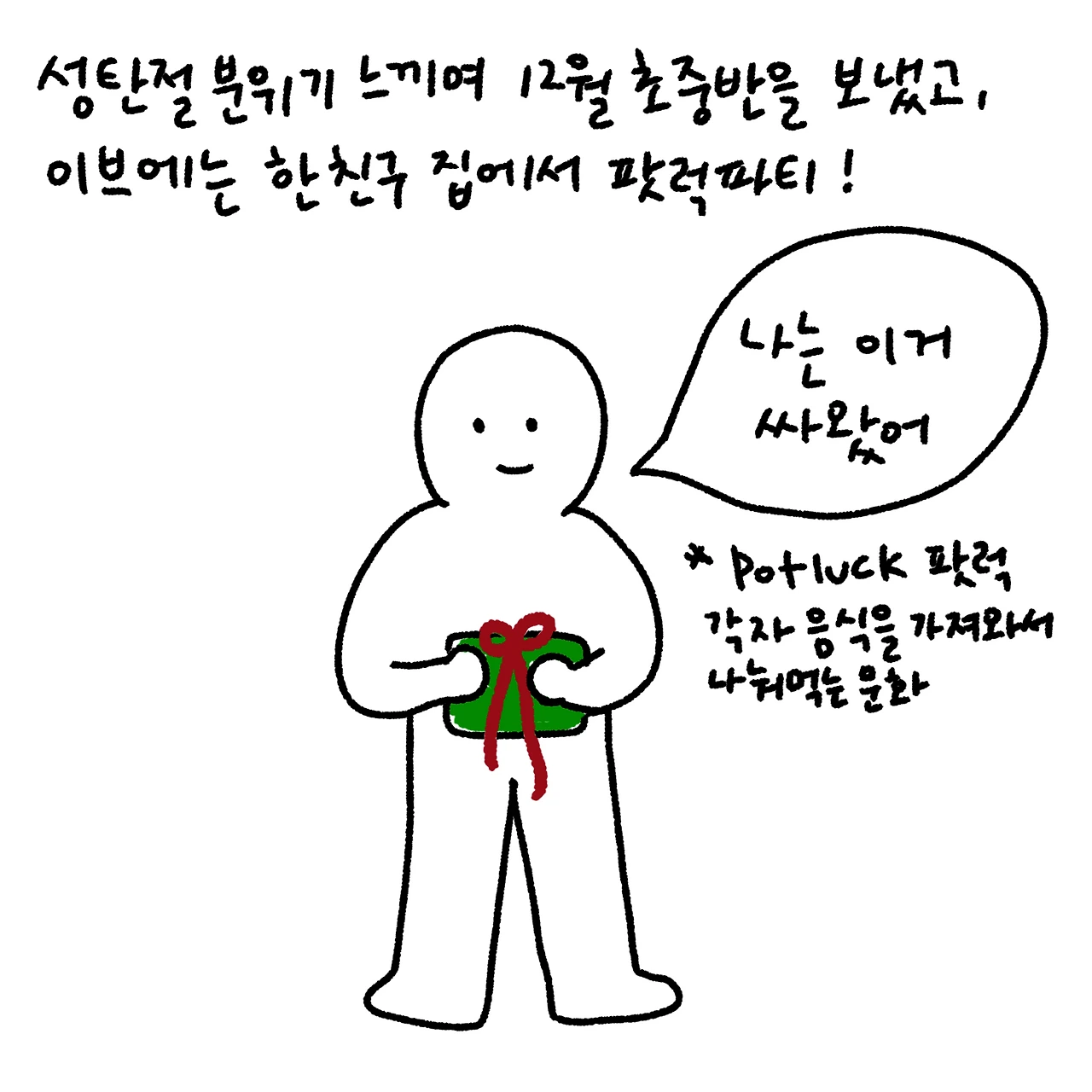 크리스마스이브에는 암만(요르단 수도)에 남아있는 한국인 친구들, 회사 사람들과 모여서 시간을 보냈다. 각자 하나씩 음식을 챙겨 와서 나눠먹는 포트럭(potluck) 파티를 했는데 각자 챙겨 온 음식을 나눠먹으며 따뜻한 연말을 보냈다. 암만의 을씨년스러운 12월 날씨 탓인지 모여서 지내는 것도 좋다고 생각한 집순이였으나, 이날 이후 다시 집순이의 길로 들어섰다.