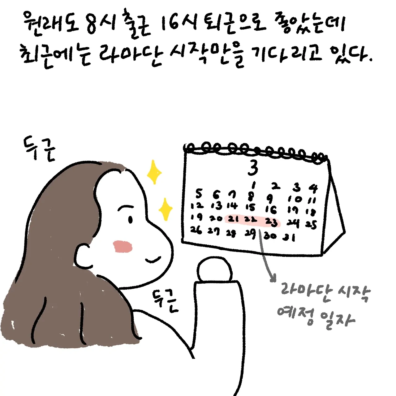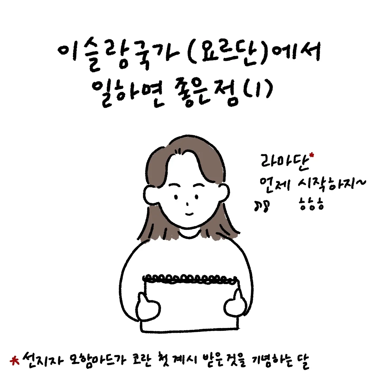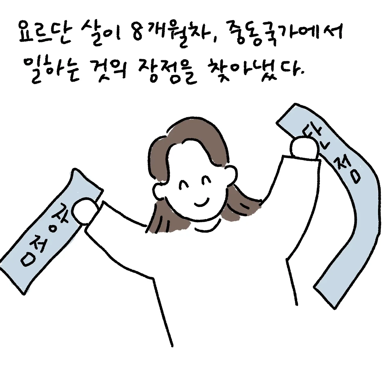 타국에서 일하는 게 쉽지는 않지만 좋은 점도 있다. 그건 바로 짧은 근무시간. 내가 일하는 곳은 8시 출근 16시 퇴근이다. 점심시간 1시간을 제외하면 7시간. 9시 출근 18시 퇴근인 한국에 비해서 짧게 일하는 편이다. 야근을 하더라도 18시 넘어서까지 한 적이 없다. 이른 출근이 조금 힘들지만 요르단은 여름이 뜨거워서 이른 출퇴근이 최선일지도. 오후 4시, 해가 지기 전에 퇴근하는 것이 얼마나 즐거운지 한국가서 곱씹을 줄 알았는데, 벌써 아쉬워하고 있다. 다음에는 어느 나라에 가서 일을 해야 이른 퇴근을 그리워 하지 않으려나.