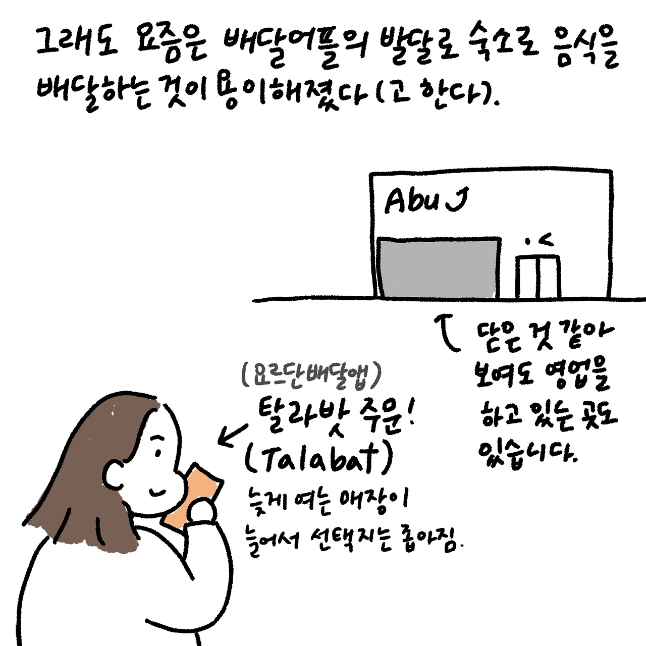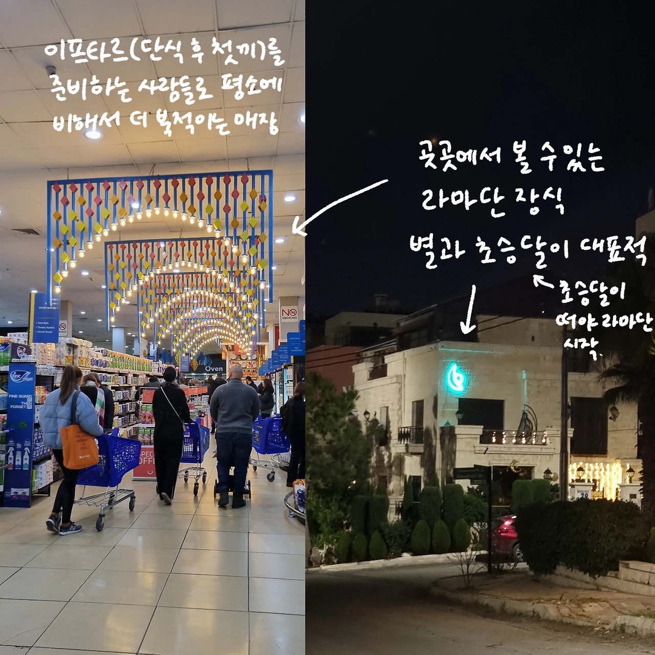 이프타르(금식 후 먹는 첫끼) 뷔페를 즐길까 했는데 그냥 평소에 먹던 요르단식 음식을 한데 모아놓고 먹기 위해 15~25JD(약 3~5만 원)을 사용하기 아까워서 먹지 않았다. 무엇보다 저녁 시간 맞춰서 외출하면 차 막히지, 배고프거나 배 채우고 들뜬 운전자의 시끄러운 경적 소리 등으로 지칠 것이 뻔했다. 대신 현지인 친구 집에서 가볍게 이프타르를 즐겼다. 이프타르가 특별히 더 잘 챙겨 먹고 그런 건 줄 알았는데 그냥 금식 후 첫 끼인 것을 알고서 달뜬 마음을 가라앉혔다. 오히려 친구 집에서 가볍게 버섯 수프, 샐러드, 양고기 구이에 생선 파스타 먹은 게 더 좋았다.