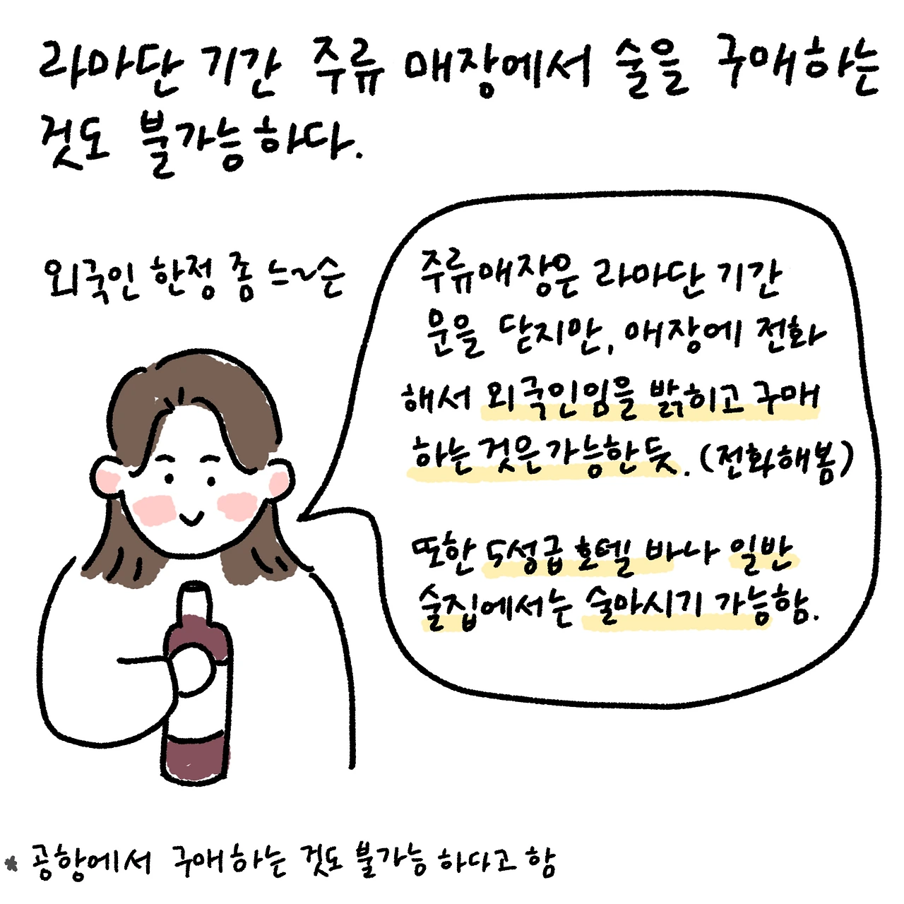외국인들이 주로 가는 카페나 식당은 대낮에도 실내 음주, 흡연이 가능하다. 5성급 호텔에서도 가능하고, 외국인인 것만 밝히면 주류 매장에서 술을 배달받을 수 있다. 대부분의 식당이 문을 닫지만 일부 업자는 국가에서 판매하는 영업 가능 권리를 구매하고 자유롭게 영업한다. 어느 나라나 돈이 있으면 문제없네. 이곳에서는 종교와 국적도 자유도에 영향을 끼치는 듯하다. 이슬람 및 중동 사람에게 더 많은 제약이 따르는 라마단. 아무래도 이슬람을 기반으로 세워진 국가라 그런 거겠지.