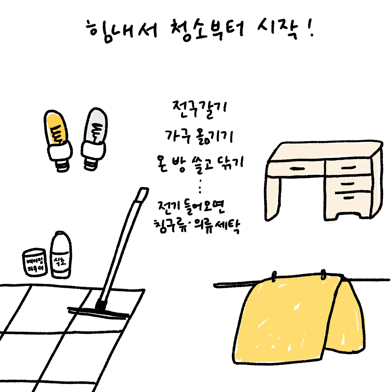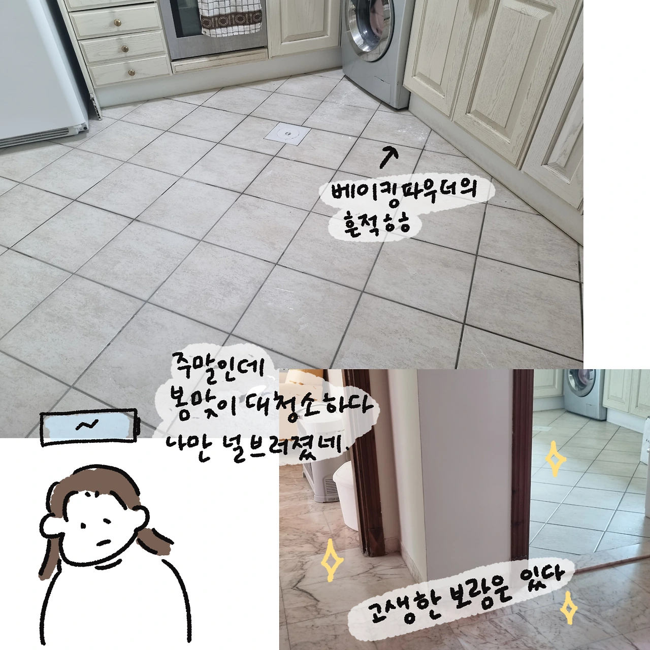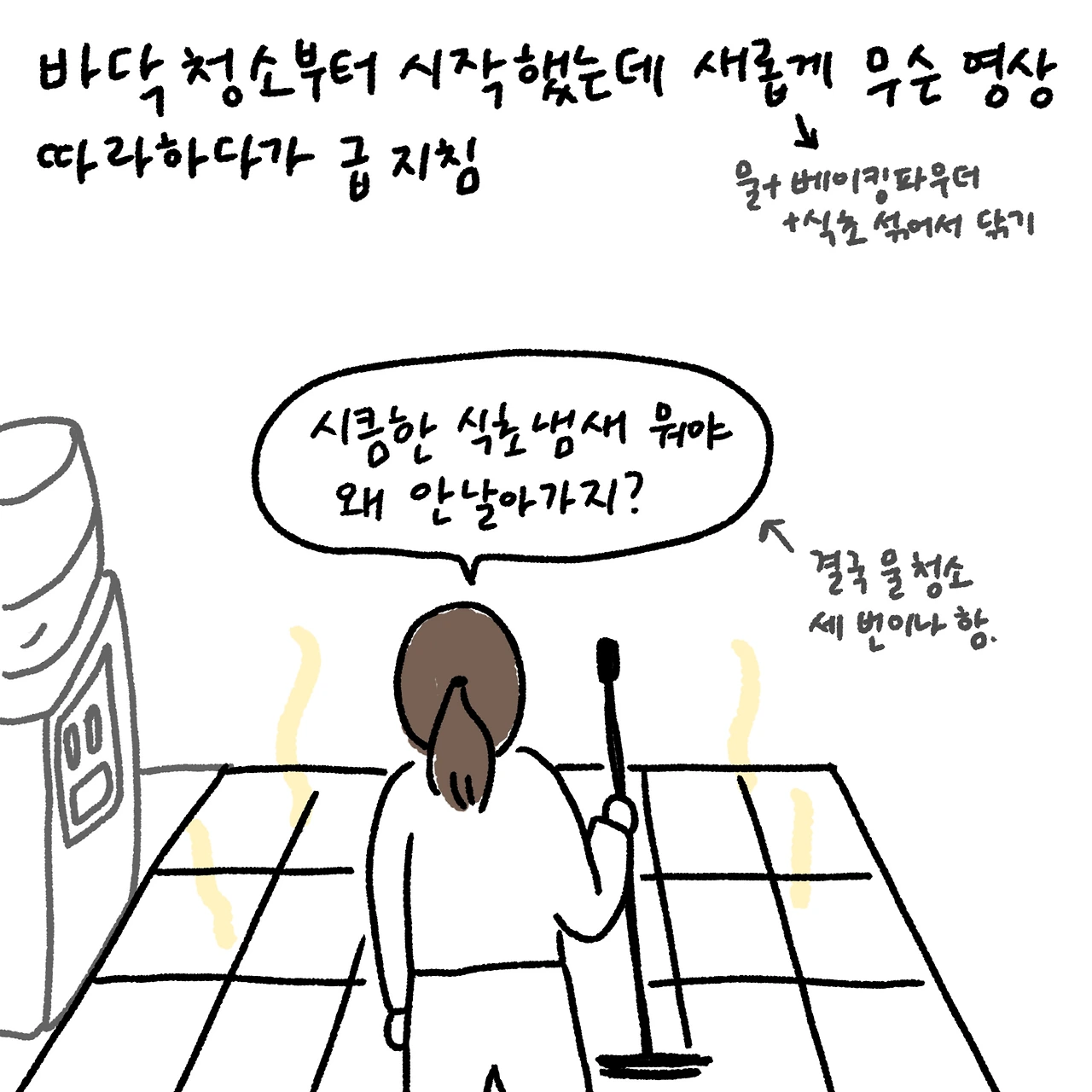 처음 요르단에서 자취를 시작했을 때는 매주 금요일에 대청소를 했다. 토요일 집콕을 위해서는 금요일에 집을 깨끗하게 하고, 먹을 것도 미리미리 준비해서 나갈 일 없도록 해야 했다. 저렴하고 편하게 이용할 수 있는 대중교통이 없는데다가 인도가 잘 갖춰지지 않았고 물가도 저렴하지 않은 암만에서 나는 외출 자제를 택했다. 금요일 거실 식탁을 시작으로 부엌 가스레인지, 냉장고, 개수대, 바닥, 작은 방과 작은 방에 딸린 화장실을 치우고 땀에 절은 몸으로 내 방도 치운다. 먼지와 땀에 절여진 상태(암만의 7월~9월은 내부도 뜨겁다)에서 내 방에 딸린 화장실 청소를 시작한다. 그리고 태양열로 뜨겁게 달궈진 물이 나오는 샤워기를 들어 몸을 구석구석 씻어낸다.