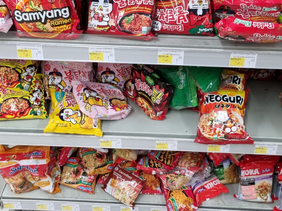 요르단에서 놀란 것. 대부분의 슈퍼마켓에 불닭볶음면이 있다. 큰 곳에만 있는 거 아닌가 했는데 동네에 있는 작은 슈퍼에도 불닭이 있다. 한국에서는 더 이상 생산되지 않는다던 불닭볶음탕도 있다. 외국에 맵기로 유명한 불닭이 널려있어 꽤 놀랐다. 한국 음식 못먹으면 어쩌나 하는 걱정이 필요 없을 정도로 한국 라면 시장이 커졌다는 사실에 기뻐하기도 했다.