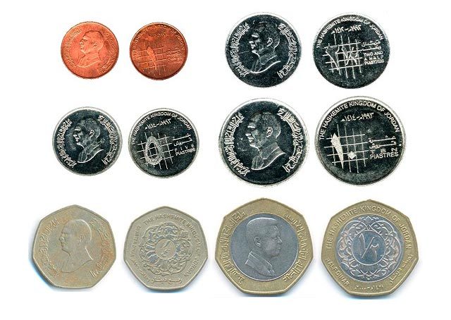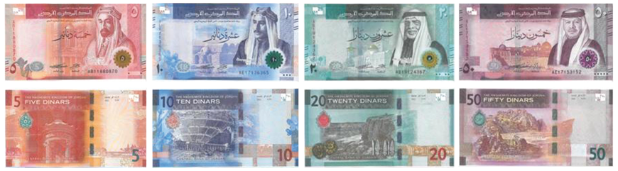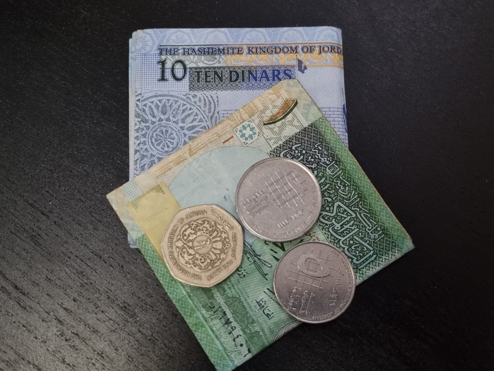 요르단에는 1, 5, 10, 20, 50 디나르 지폐와 1, 5, 10, 25, 50짜리 동전이 있다. 요르단 동전 사진을 찍어둔 것이 보이지 않아 은행에 올라온 동전 사진으로 대체하는데 사진에서 오른쪽 맨 위 동전은 내가 써본 적이 없는 동전이다. 2023년도에 요르단 새 지폐가 발행되어 색, 크기 그리고 그림이 약간 다른 지폐를 받을 수도 있다. 위조지폐 아니고 구권이니 당황하지 않아도 된다.