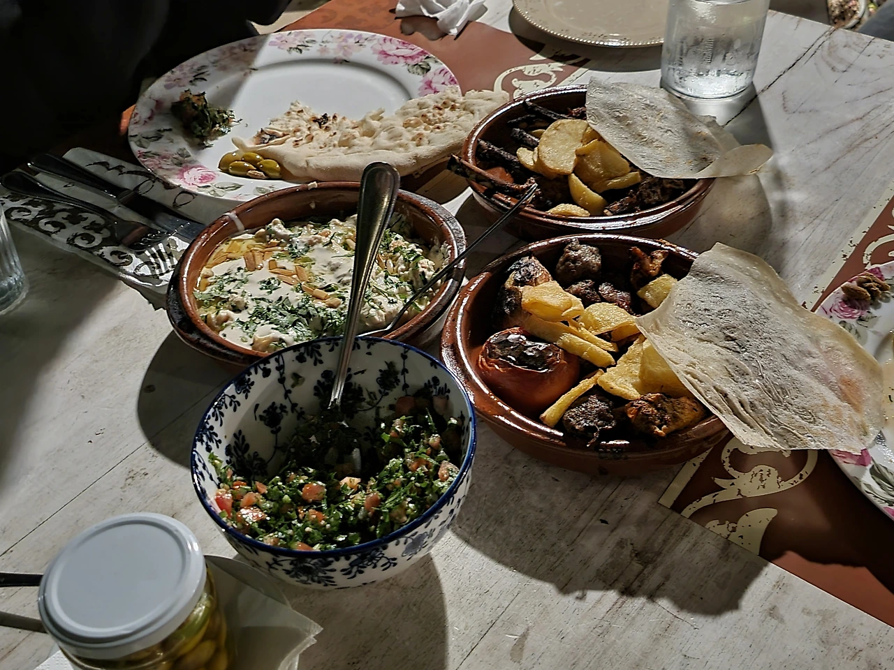 친구가 좋아하는 타불레(Tabbouleh)와 훔무스 파테(Hummus Fatteh)를 고른 뒤 직원한테 추천을 부탁하니 양고기를 추천해 줬다. 샐러드, 메제 각 1개씩 시키고 양갈비와 구이류까지 주문했다. 음식이 나오길 기다리며 기본제공 된 빵과 식탁 위에 놓인 올리브 절임을 맛보았다. 갓 구워져 뜨끈한 빵을 뜯어, 올리브와 한 입 먹었다. "토딘! 이거 진짜 맛있어." 하고 옆을 보고 이미 올리브와 빵을 음미 중인 친구가 보였다. 요르단에 와서 양고기를 처음 먹었다는 토동도 뭔가를 열심히 먹고 있었다. 요르단 식당에서는 갓 구운 빵을 무제한 먹을 수 있는 것과 맛있는 올리브가 기본 제공 되는 것이 좋다. 빵 한 개 먹고 금방 배가 부르지만.
