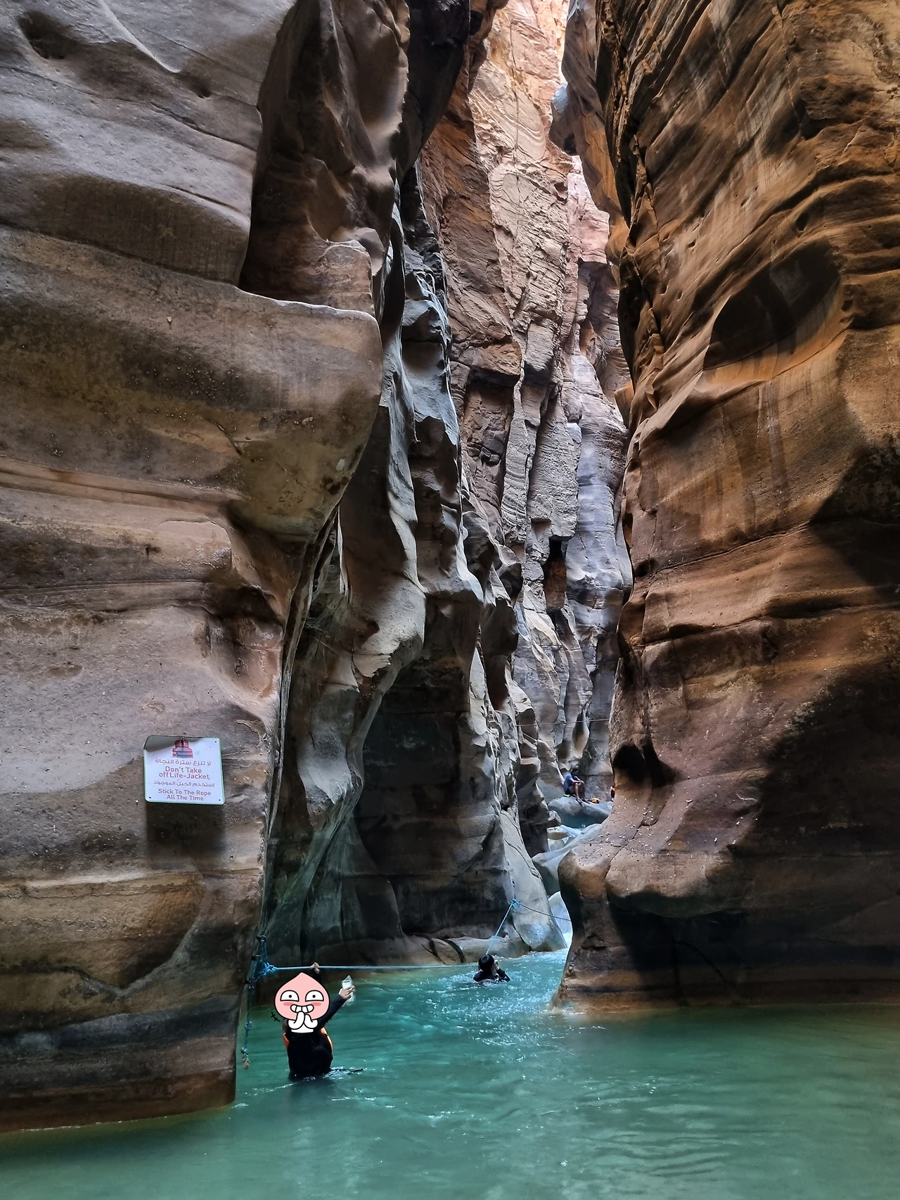요르단패스의 힘을 발휘될 수 없는 곳이 바로 와디 무집이다. 현지인과 같은 대우를 받는 나조차도 18JD를, 친구들은 나보다 더 비싼 21JD를 입장료로 지불했다. 아쿠아 슈즈나 방수팩은 유료로 대여 가능하다. 직원이 준 구명조끼를 입고 들어가니 절벽과 얕은 개울이 보였다. 와디 무집에는 여러 가지 트레킹 코스가 있는데 우리는 계곡에서 즐길 수 있다는 알 시크(Al Siq) 트레일을 택했다. 생각보다 물이 없어 아쉬운 것도 잠시 어느새 계곡물이 목 끝까지 차올랐고, 바닥에 발이 닿지 않아 설치된 밧줄을 잡지 않고서는 이동할 수 없는 구간도 있었다. 곡 깊숙이 들어갈수록 사람들의 "악!", "꺄아!"소리가 점점 더 크게 들렸다. 어떤 지점은 수심이 2m는 되는 듯했는데 수속성 친구들은 수영을 하며 앞으로 나아갔다. 나는 밧줄을 생명줄 삼아 바위에 바싹 붙어 이동했다. 이때까지만 해도 와디무집 재미있는데? 정도였다.