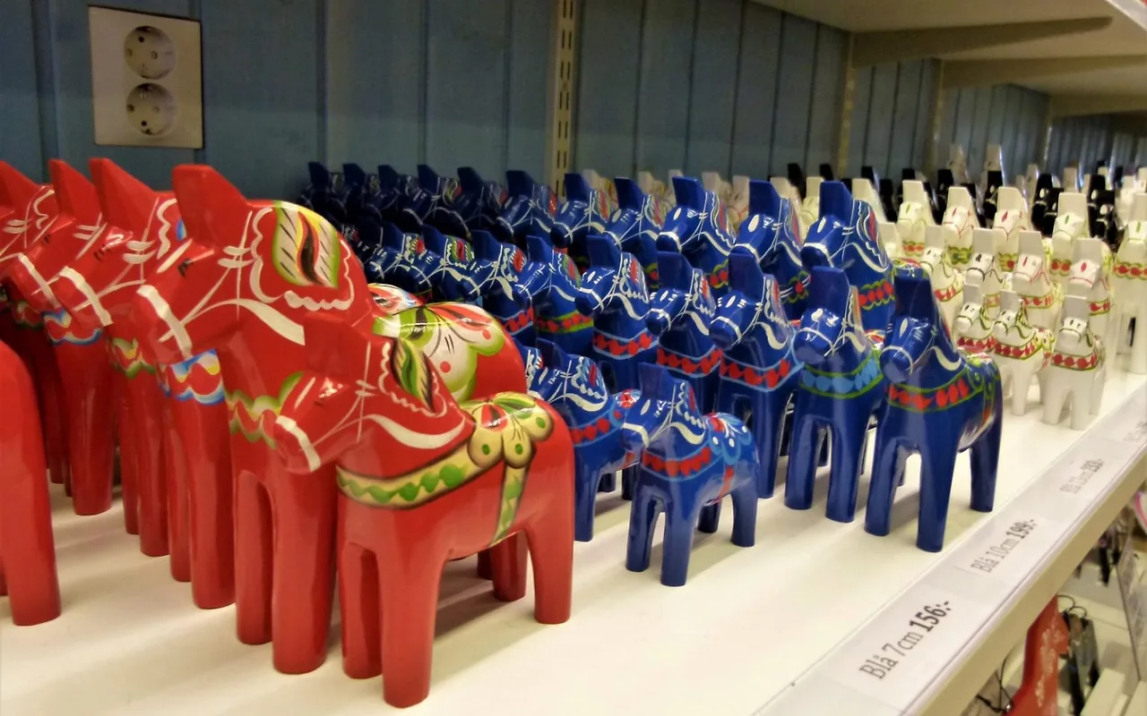 오래된 듯한 목각인형이 눈에 들어왔다. 자세히 보니 꼬리가 없는 말 모양이다. 주인분께 여쭤보니 스웨덴을 대표하는 민속 공예품 '달라호스 Dalahorse' 라 한다. 스웨덴어로는 달라허스트 Dalahäst라고 현지 발음도 알려주셨다. 이 전통 목각 말은 스웨덴 중부에 있는 달라르나 Dalarna지방의 나무꾼들이 일을 마치고 자녀들을 위해 만든 목각 말에서 시작되었다 한다. 길고 긴 북유럽의 겨울밤, 마땅한 장난감이 없던 아이들에게 손수 깎아 만든 나무말을 선물한 아버지의 사랑이 전해져 내려와 '행복을 나르는 말'로 알려졌다. 여전히 스웨덴 몇 개의 마을에서 전통적인 수공업 방식으로 만들어지는데, 그래서 세상에 똑같은 모양이 하나도 없단다. 조각에 적합한 최상급 소나무를 골라 깎고, 다듬고, 색을 칠하는 여러 과정을 거쳐 만들어지기에 귀한 공예품이라 한다. 내가 본 달라호스는 대량 생산되기 훨씬 전 만들어진 진귀한 목각인형이라 한다.